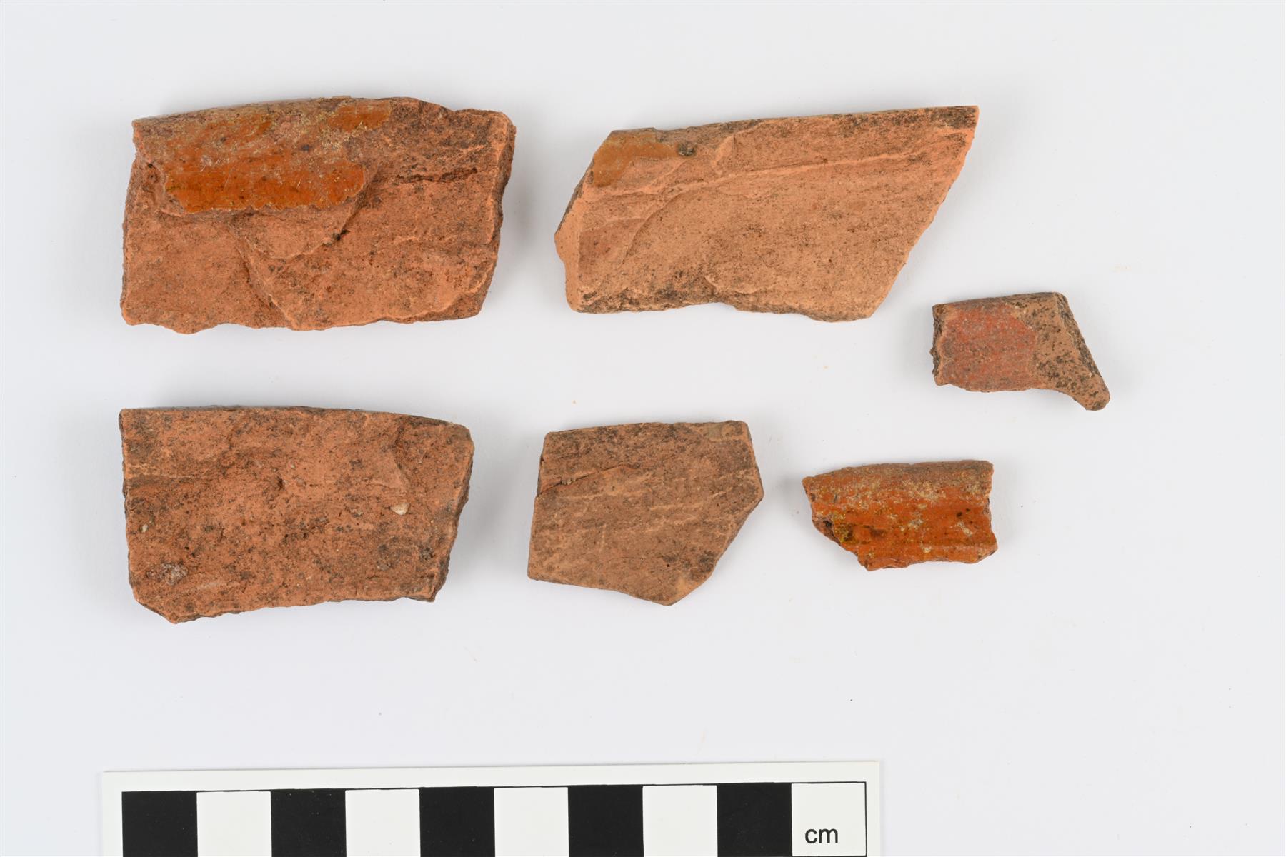 | Suureunapaloja eri astioista. Pinnat osittain lohjenneet pois, sisäpinnalla tai reunan päällä rippeitä värittömästä lyijylasitteesta. | |