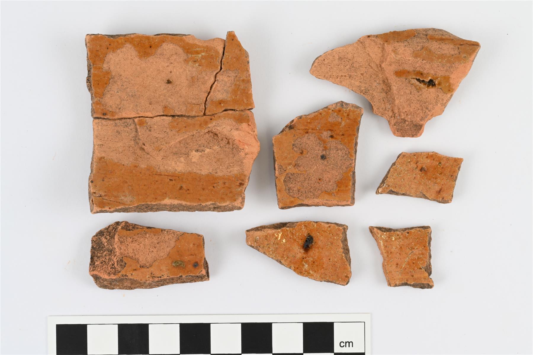 | Kylkipaloja samasta astiasta, osa paloista yhteensopivia ja liimattu yhteen. Yksi pala reunan alta ja ulkopinnalta profiloitu, osassa kylkipaloja ulkopinnalla rihlausta. Sisäpinnalla väritön, oranssinsävyinen lyijylasite, jossa ruskeita pilkkuja. Mahdollisesti alankomaalaisesta tai friisiläisestä astiasta. | |