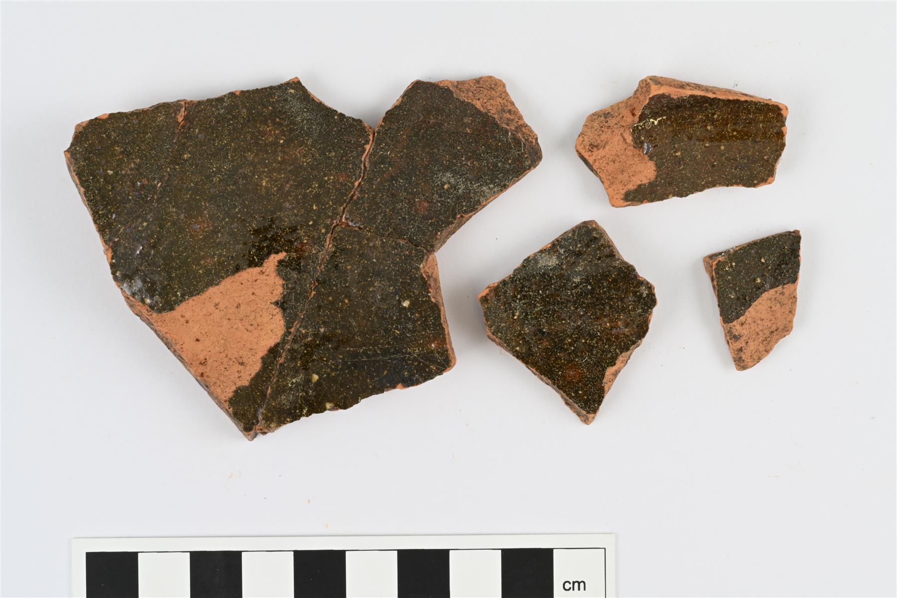 | Kylkipaloja luultavasti samasta astiasta, osa paloista yhteensopivia ja liimattu yhteen. Sisäpinnalla tummanvihreä lyijylasite. | |