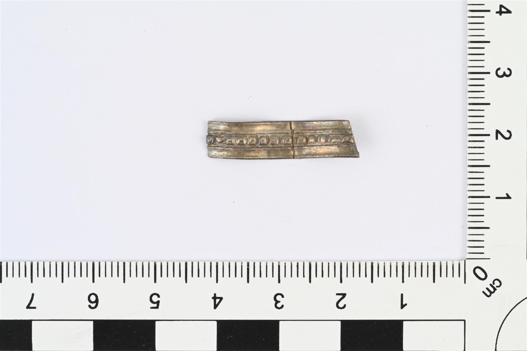 | Tasalevyisen sormuksen katkelma, ohutta levyä. Etupuolella reliefikoristeluna keskellä pitkittäinen helminauhakoriste. Etupuolella kultaus. | |