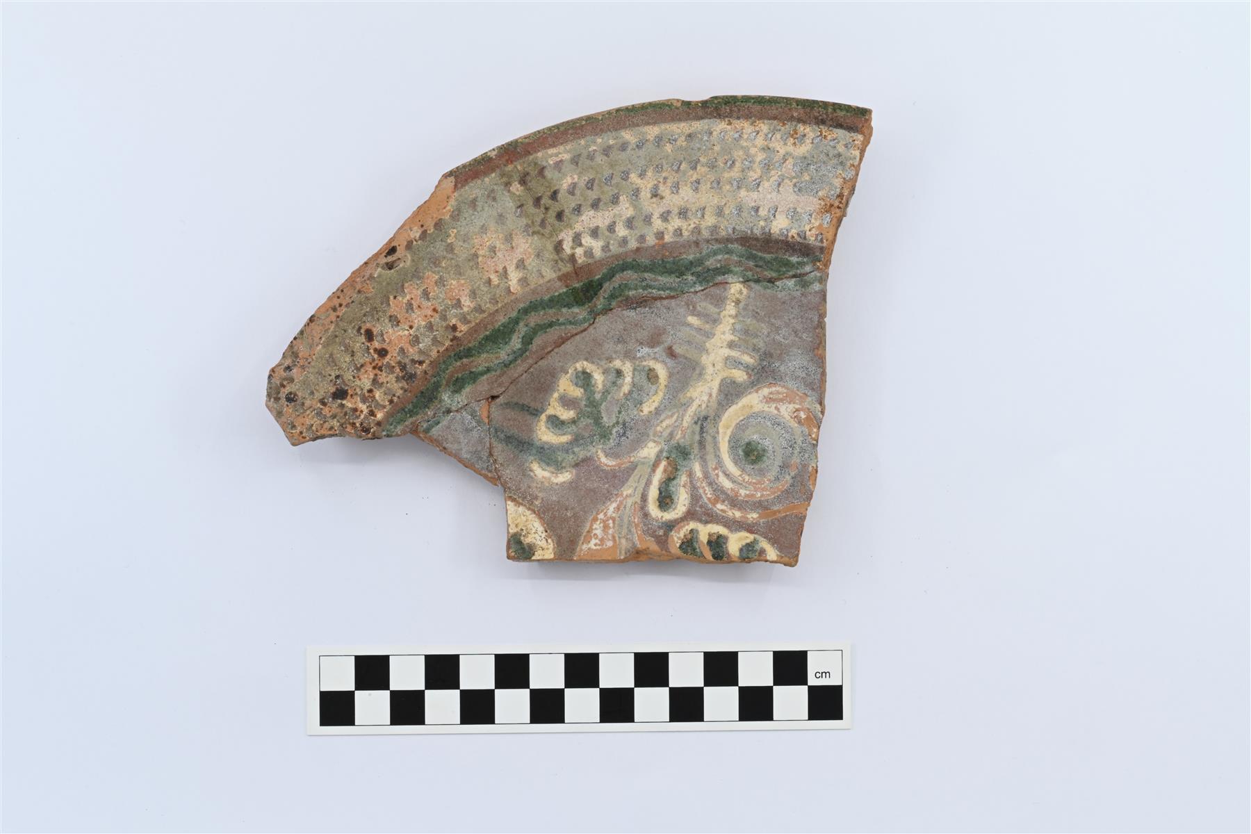 | Matalan boluskoristeisen vadin yhteensopivia paloja, palat liimattu yhteen. Neljä suureunapalaa, pohjapala ja kylkipala. Suureunan ulkopinnalla paksunnos. Sisäpinnalla reunassa vyöhyke valkosavilietettä, johon uurrettu hemring-koristelua, reunan alapuolella kaksi vihreää aaltoviivaa ja pohjassa ja kyljen alaosassa runsas valkosavella ja vihreällä värillä tehty kasviaiheinen koristelu. Sisäpinnalla myös rippeitä värittömästä lyijylasitteesta. Vadin korkeus noin 40 mm ja suun halkaisija noin 310 mm. | |
