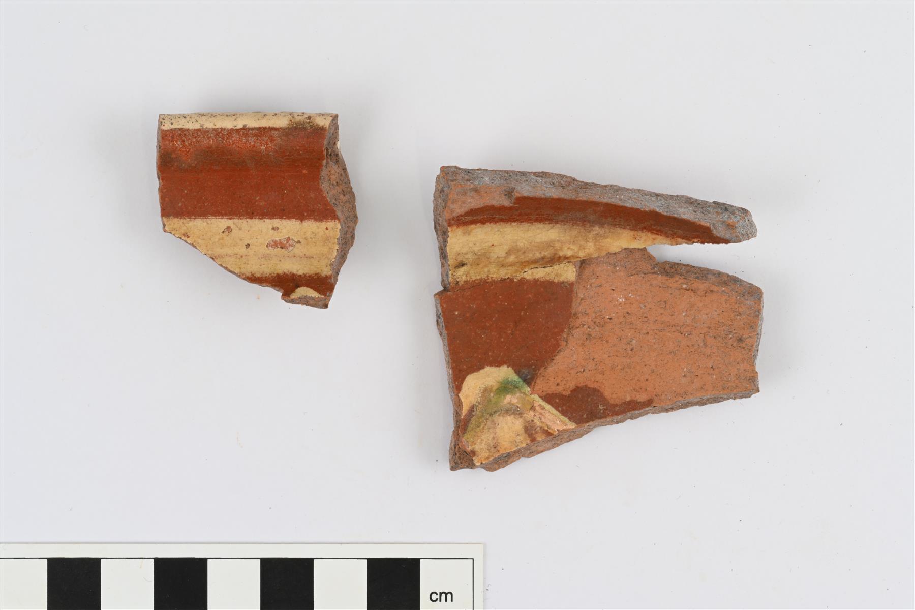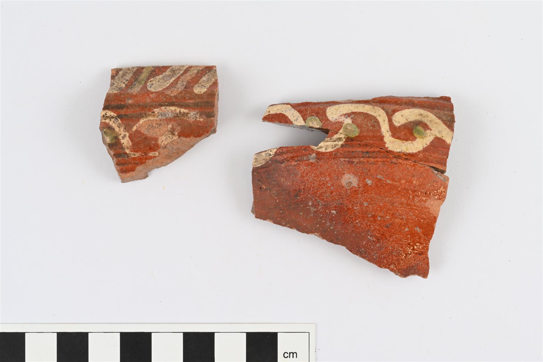 | Boluskoristeisen kulhon suureunapala ja kylkipaloja, luultavasti samasta astiasta. Kylkipalat yhteensopivia ja liimattu yhteen. Reuna voimakkaasti sisäänpäin kaartuva. Ulkopinnalla reunan alapuolella kaartuvassa kohdassa horisontaaleja uria kahtena vyöhykkeenä. Urien väliin ja osittain päälle tehty valkosavella aaltoviivakuvio, jossa myös vihreitä pisteitä. Reunan ulkopinnalla rivi pieniä valkosavivinoviivoja, joista joka toisen päällä vihreää väriä. Reunan päällä kapea valkosaviraita. Sisäpinnalla reunan alapuolella leveä valkosaviraita ja alempana kyljessä katkelma valkosavella ja vihreällä värillä tehdystä kuviosta. Molemmilla pinnoilla väritön lyijylasite. | |