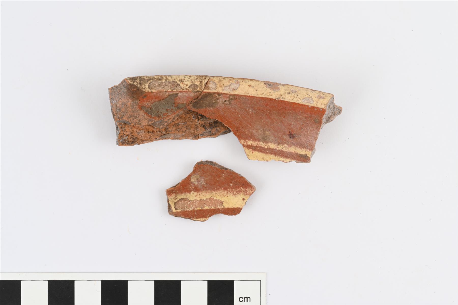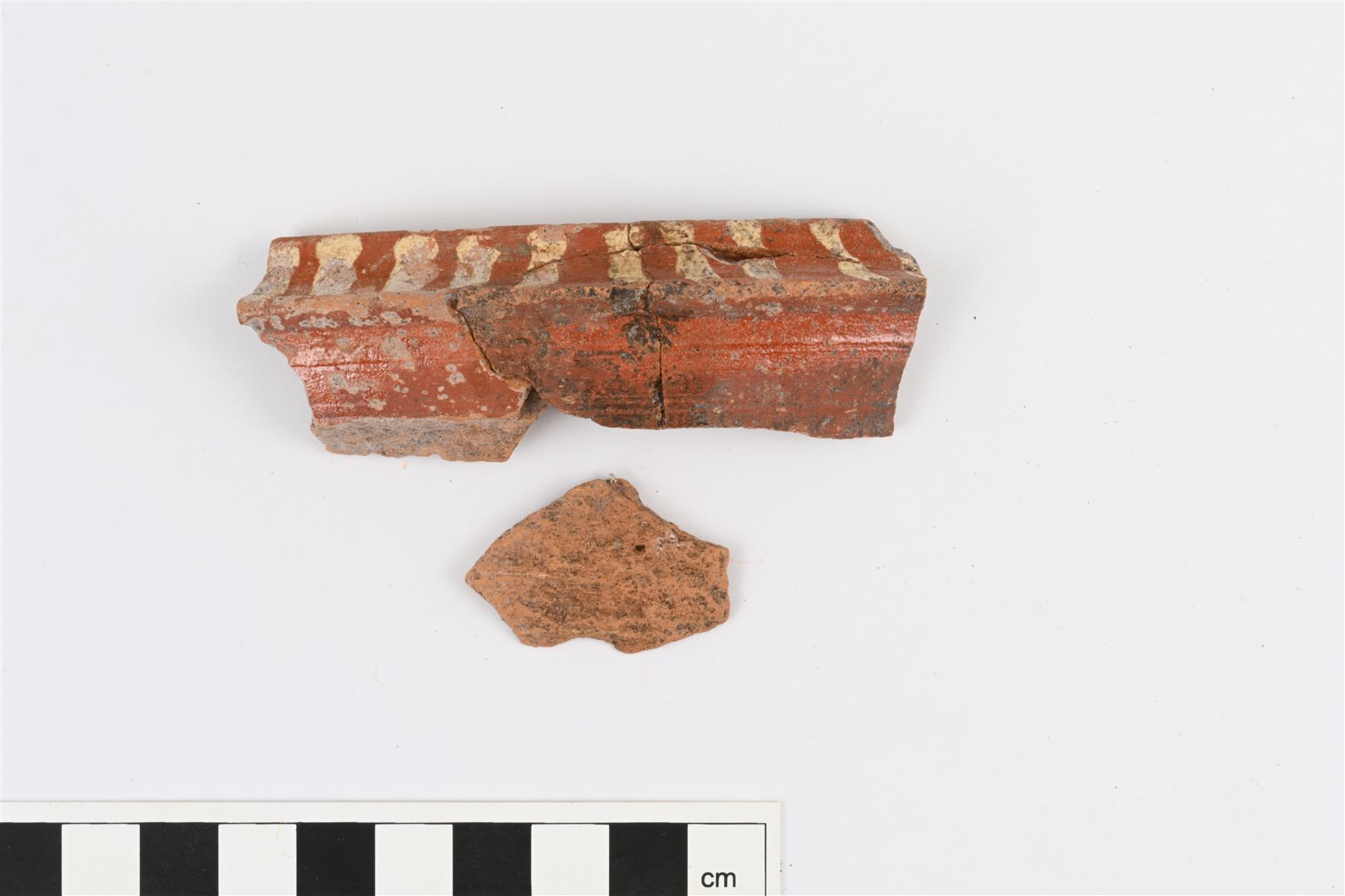 | Boluskoristeisen kulhon suureunapala ja kylkipaloja, samasta astiasta. Palat yhteensopivia ja osa liimattu yhteen. Reuna sisäänpäin kaartuva, ulkopinnalla heti reunan alapuolella voimakas harjanne. Reunan ulkopinnalla rivi pieniä valkosavipystyviivoja. Reunan päällä valkosaviraita, myös sisäpinnalla reunan alapuolella valkosaviraitoja. Molemmilla pinnoilla väritön lyijylasite. | |