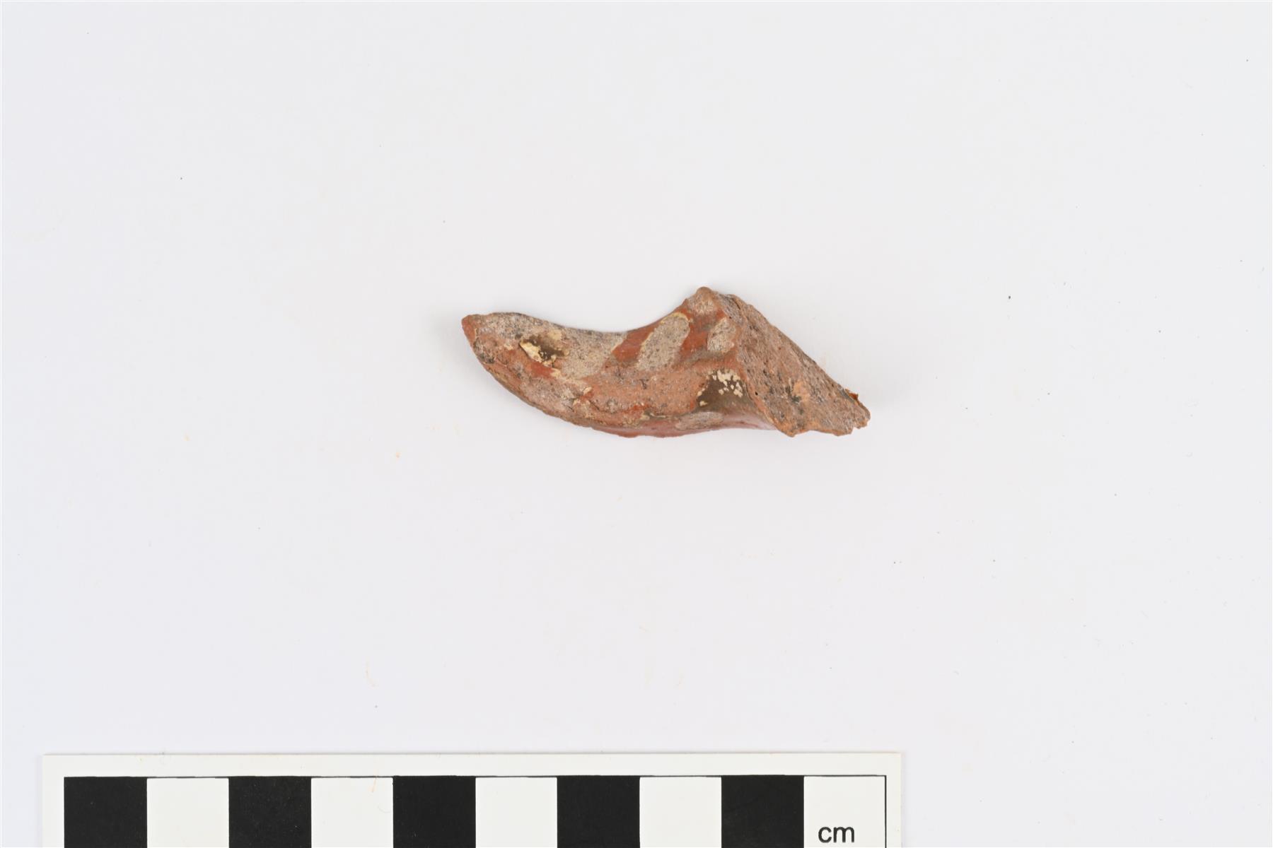 | Boluskoristeisen kulhon korvan katkelma. Pinnalla valkosavella tehtyjä vino- tai pystyviivoja ja väritön lyijylasite. Mahdollisesti astiasta KM 46903:116 tai :117. | |