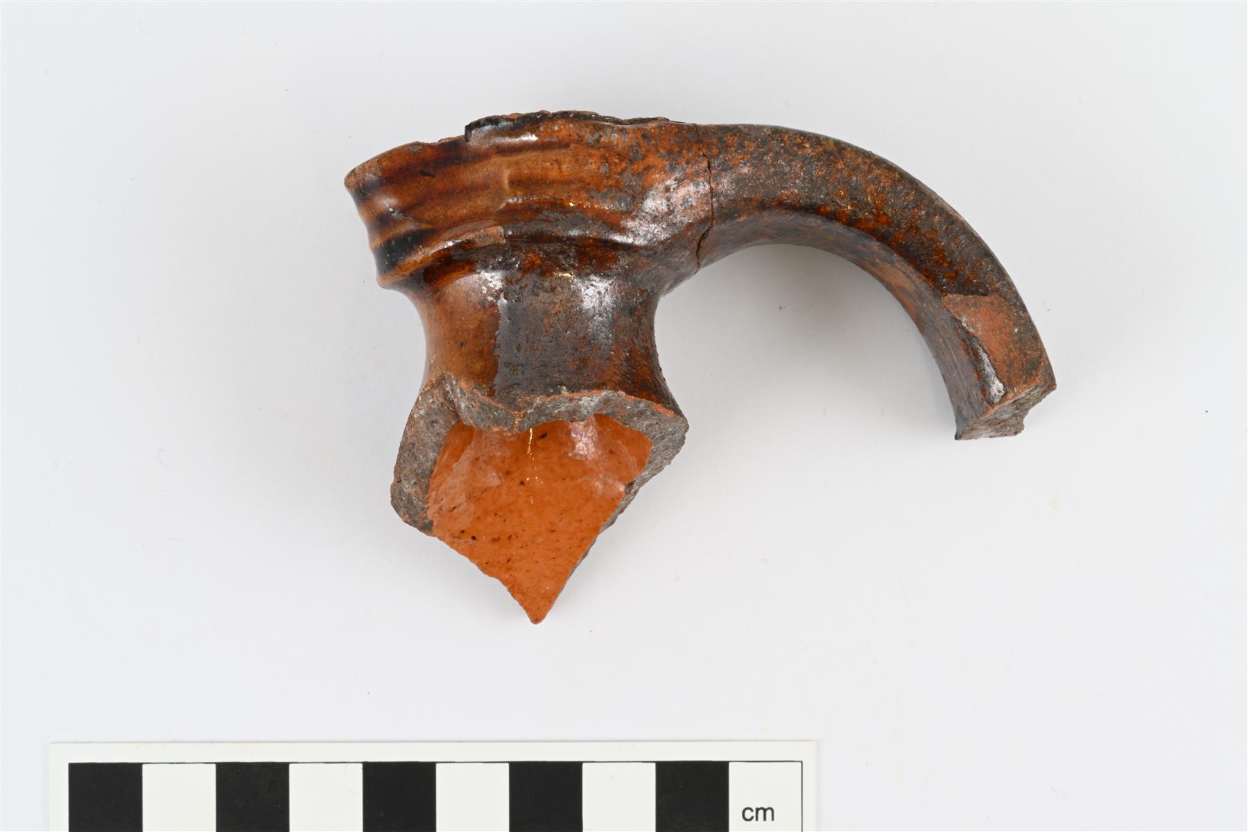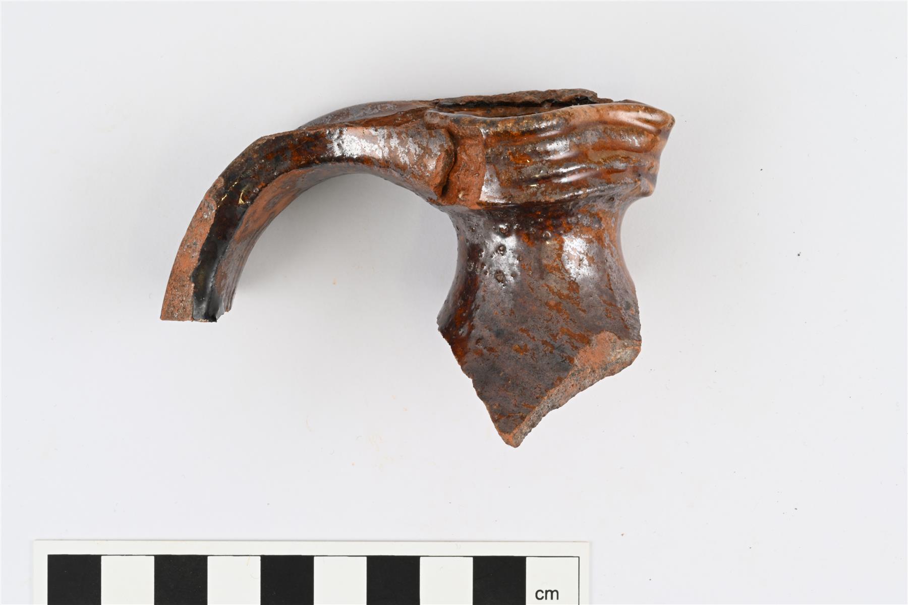 | Kannun tai pullon ehjä suu ja yhteensopiva korvan katkelma, palat liimattu yhteen. Pieni suu ja lyhyt kapea kaula. Suun ulkopinnalla 17 mm levyinen paksunnettu reunus, jossa horisontaaleja uria. Reunukseen liittyy leveä ja litteä vertikaali korva, korvaa vastapäätä muotoiltu kaatonokka. Molemmilla pinnoilla lyijylasite, joka ulkopinnalla läikikäs ruskea ja sisäpinnalla oranssinsävyinen väritön. Suureunan päällä lasitteen päälle tarttunut ylimääräistä savimassaa. Kaulan ja suun korkeus yhteensä noin 36 mm, suun leveys ulkopinnasta 42 mm, suun sisähalkaisija noin 18 mm. | |