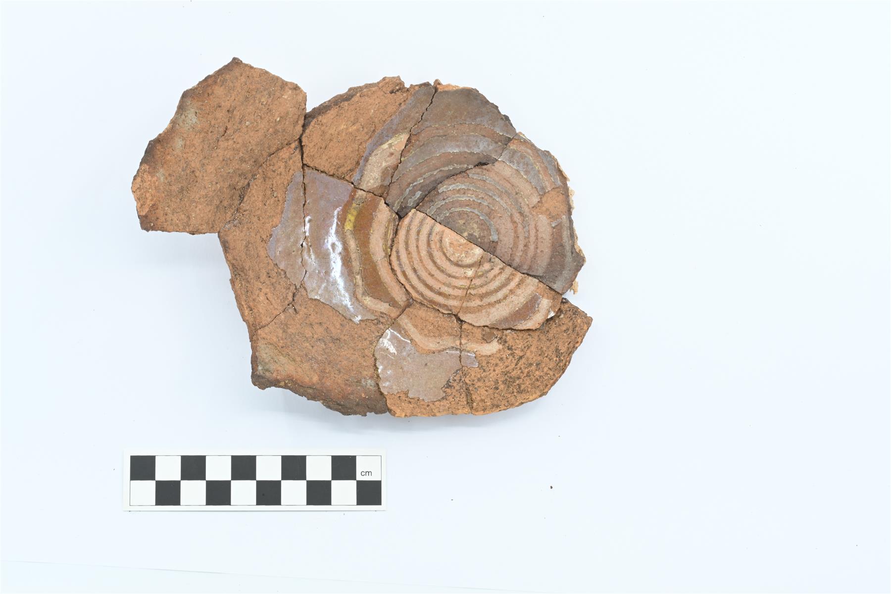 | Boluskoristeisen vadin pohja- ja kylkipaloja, palat yhteensopivia ja yhteen liimattuja. Pohjareuna profiloimaton. Sisäpinnalla pohjassa valkosaviraitoja ja -aaltoviiva sisäkkäisinä kehinä, kyljen alaosassa ei koristelua, kyljen yläosasta pinta lohjennut pois. Sisäpinnalla myös väritön lyijylasite. Pohjan halkaisija 110 mm. | |