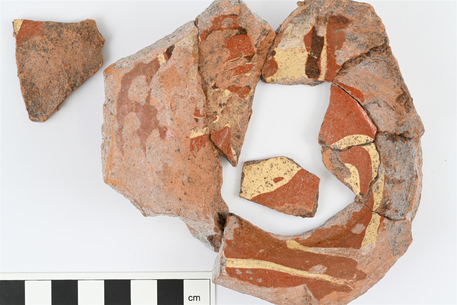 | Boluskoristeisen kulhon yhteensopivia pohjapaloja, palat osittain yhteen liimattuja. Pohjareuna profiloitu. Sisäpinnalla runsas valkosavella ja ruskealla värillä tehty koristelu ja väritön lyijylasite. Pohjan halkaisija 97 mm. | |