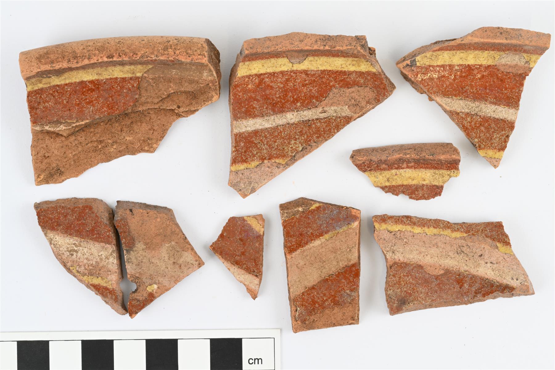 | Boluskoristeisen vadin suureuna-, pohja- ja kylkipaloja, osittain yhteensopivia. Suureuna sisäänpäin kiertyvä, ulkopinnalla paksunnos. Sisäpinnalla valkosaviraitoja ja väritön lyijylasite. Kyljessä astian korjaamista varten tehty pieni reikä, jonka ympäriltä lasite jauhautunut pois. | |