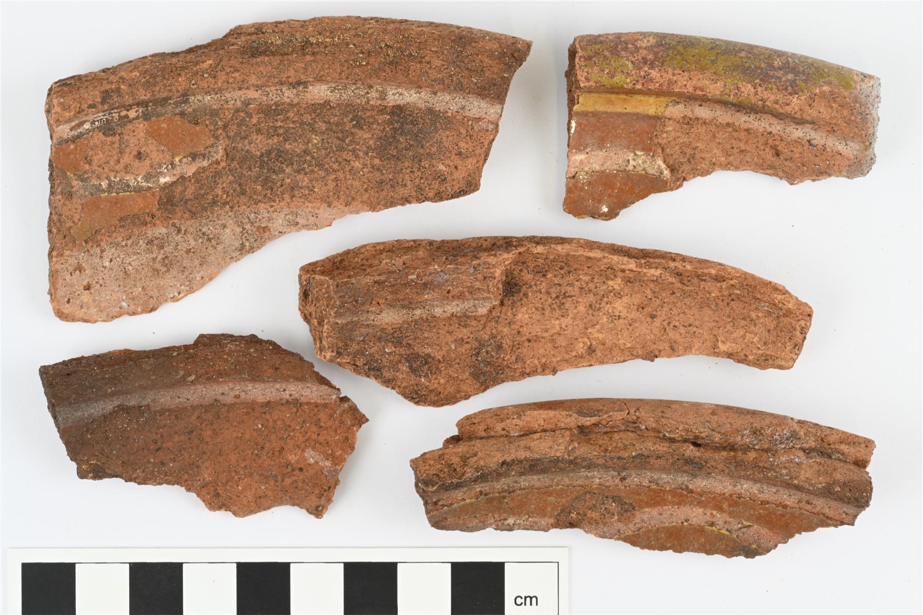 | Boluskoristeisen vadin suureunapaloja, osittain yhteensopivia ja yhteen liimattuja. Suureuna sisäänpäin kiertyvä, ulkopinnalla paksunnos. Sisäpinnalla valkosaviraita ja -aaltoviiva sekä väritön lyijylasite. | |