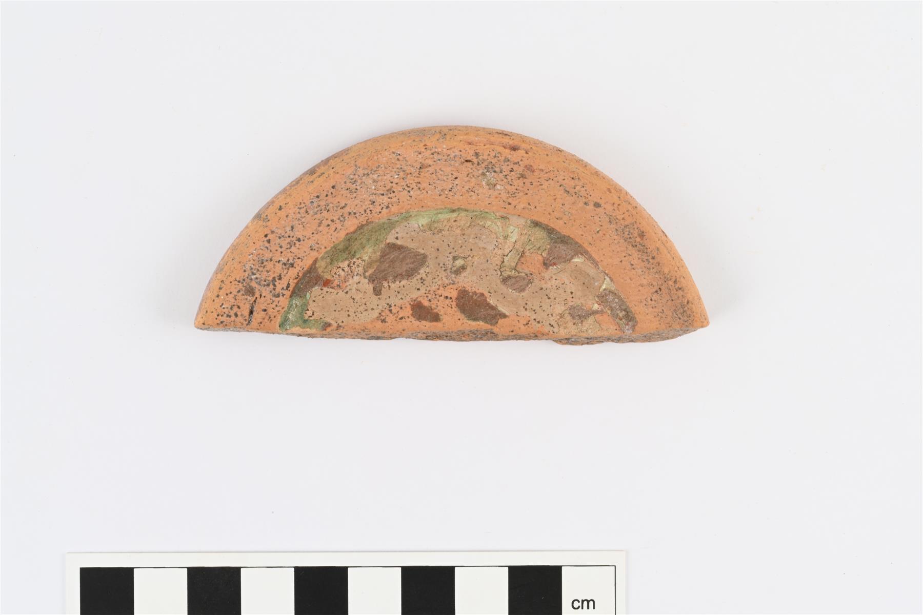 | Boluskoristeisen kulhon pohjapala. Pohjareuna profiloitu. Sisäpinnalla valkosavella ja vihreällä värillä tehtyjä kuvioita sekä väritön lyijylasite. Pohjan halkaisija 100 mm. | |