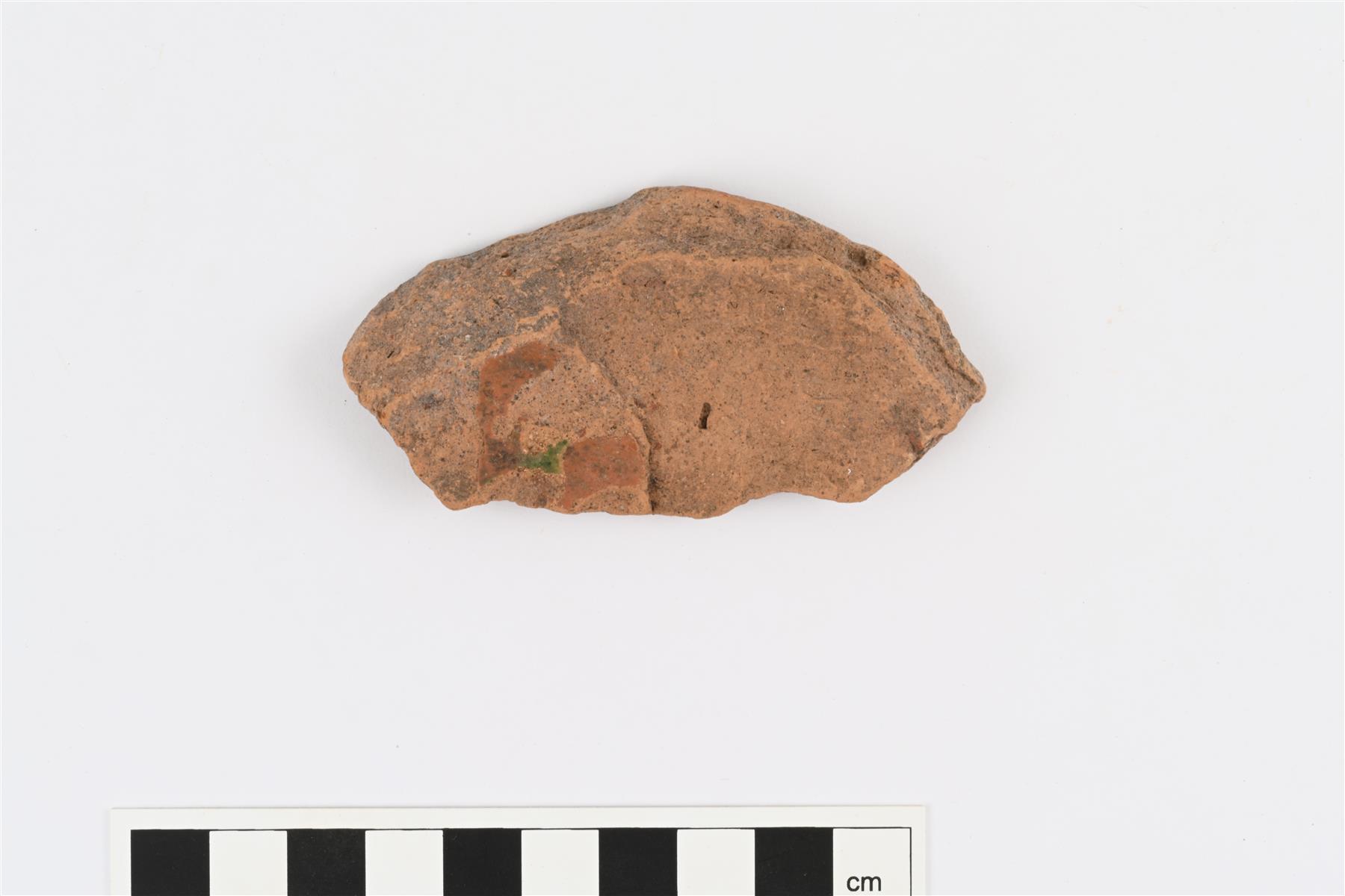 | Boluskoristeisen kulhon pohjapala. Pohjareuna profiloitu. Sisäpinnalla valkosavella ja vihreällä värillä tehtyjä kuvioita sekä väritön lyijylasite. Pohjan halkaisija noin 100 mm. | |