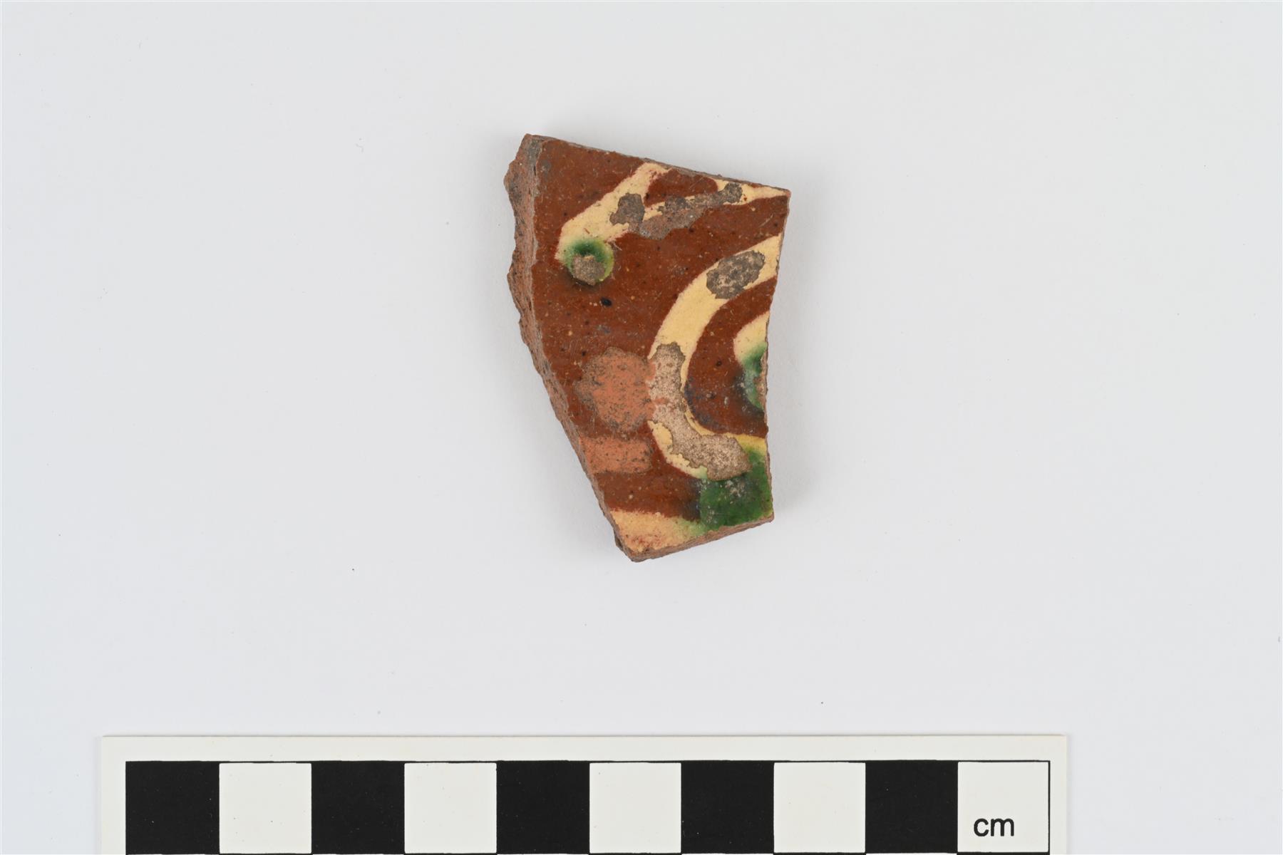 | Boluskoristeinen kylkipala. Sisäpinnalla valkosavella ja vihreällä värillä tehtyjä kuvioita sekä väritön lyijylasite. | |