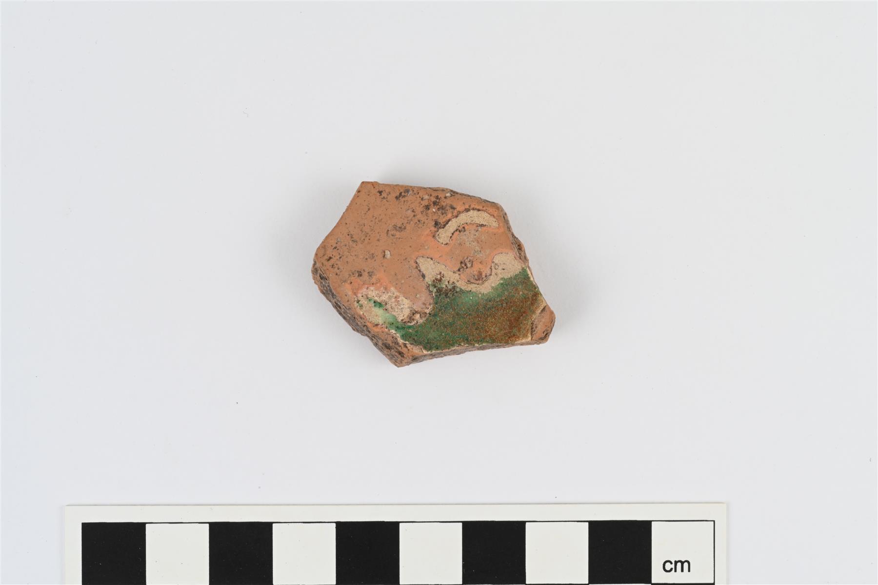 | Boluskoristeinen kylkipala. Sisäpinnalla rippeitä valkosavella ja vihreällä värillä tehdyistä kuvioista sekä värittömästä lyijylasitteesta. | |