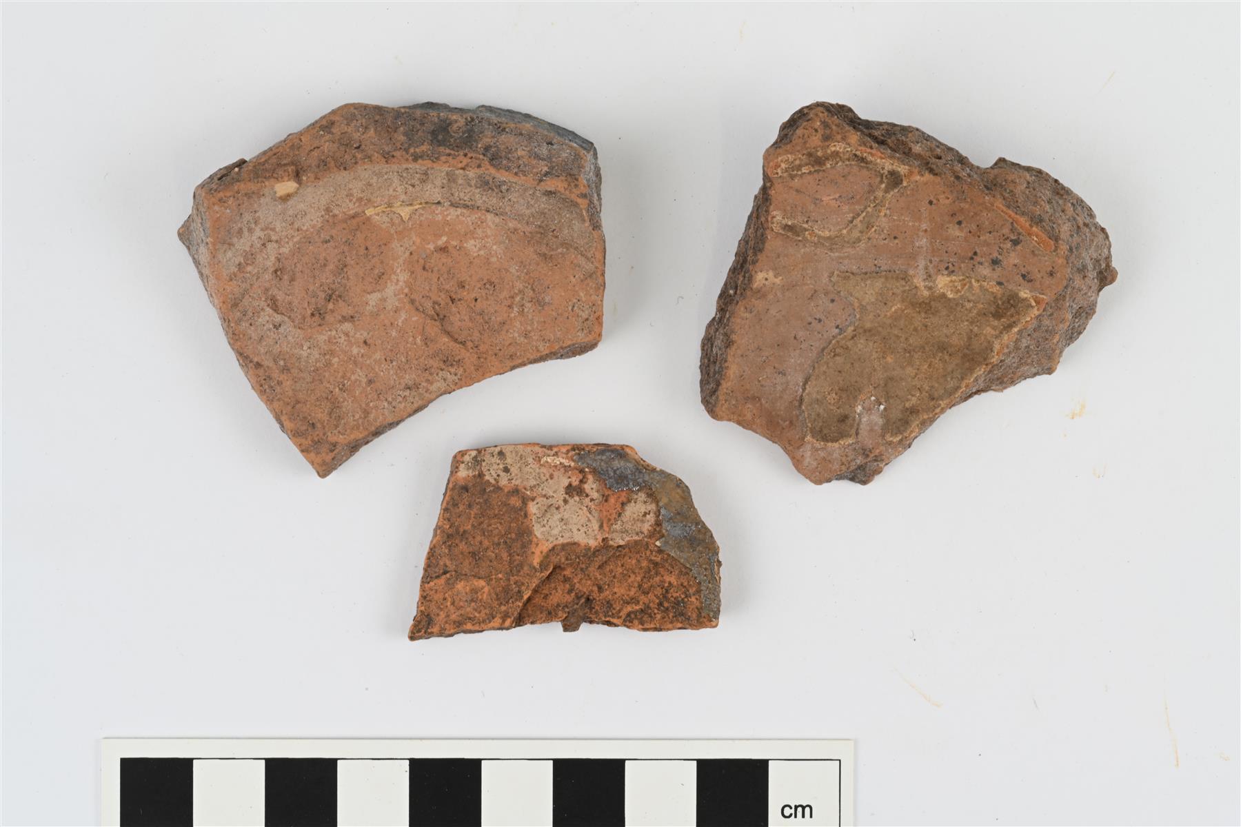 | Valkosavikoristeisten kulhojen pohjapaloja, eri astioista. Säilyneet pohjareunat profiloitu. Sisäpinnalla rippeitä valkosavilietteestä ja värittömästä tai samentuneesta lyijylasitteesta. | |