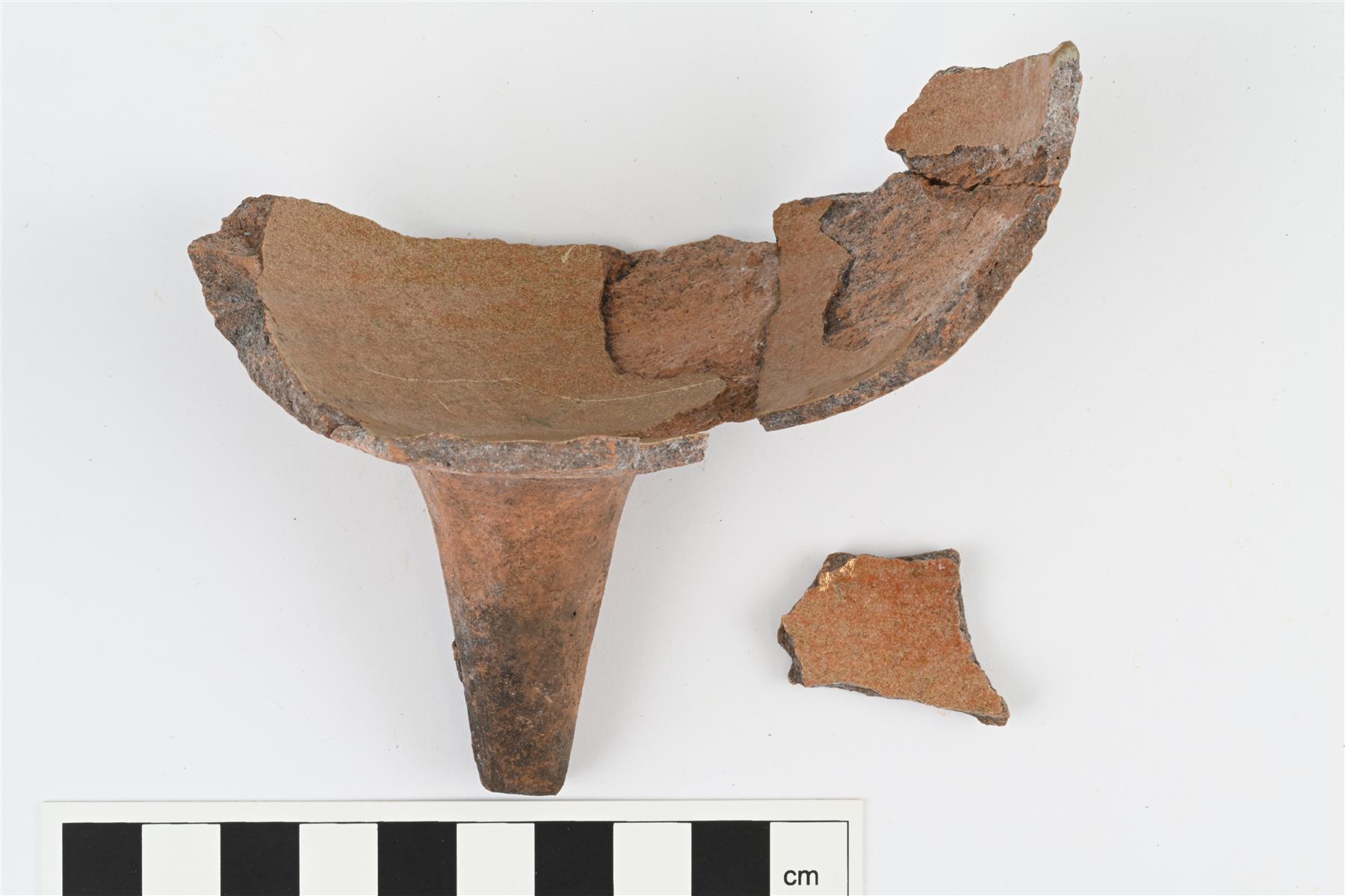 | Pienen kolmijalkapadan pohja- ja kylkipaloja sekä jalka, osittain yhteensopivia ja yhteen liimattuja. Kyljen ulkopinnalla rihlausta. Jalka suora ja alaspäin suippeneva. Sisäpinnalla väritön kellertävä lyijylasite. Ulkopinta osittain mustunut. | |