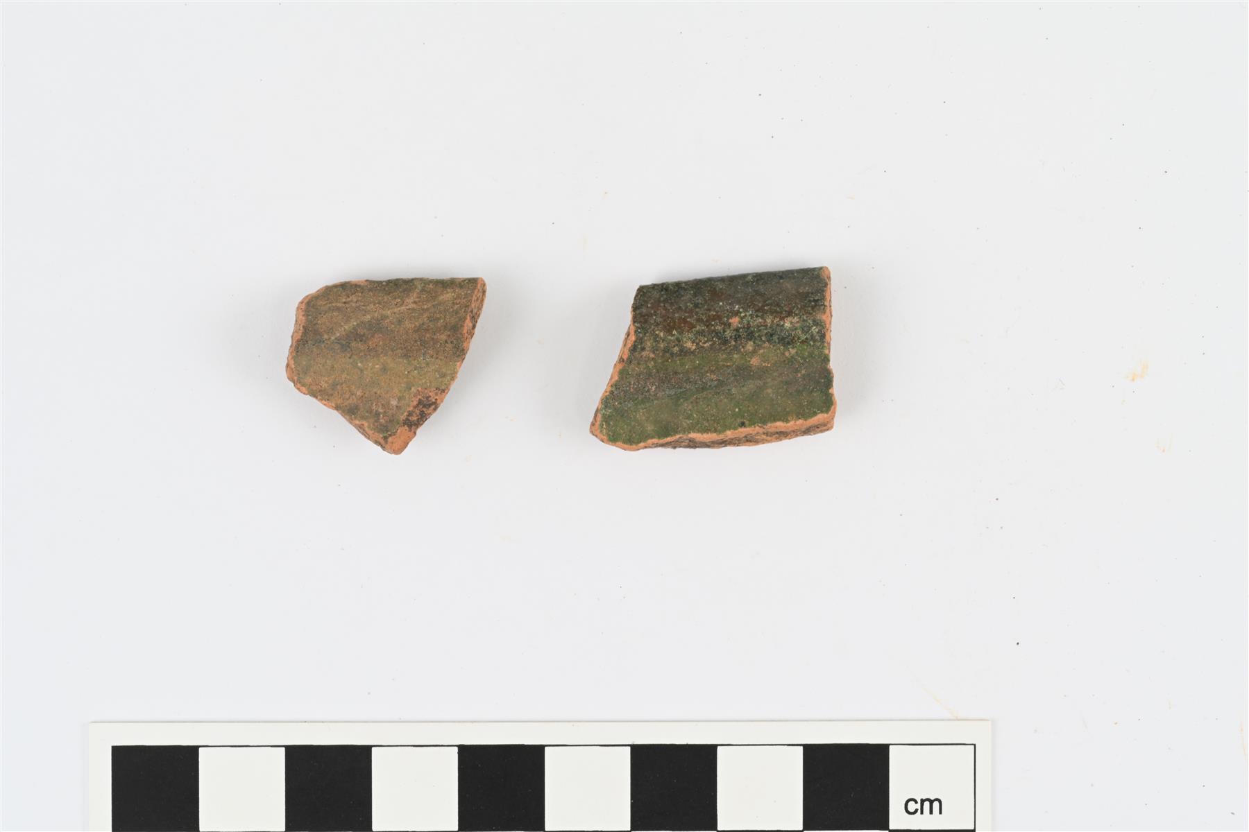 | Kulhon suureunapaloja, luultavasti samasta astiasta. Reunan ulkopinnalla uria. Sisäpinnalla vihreä lyijylasite. | |