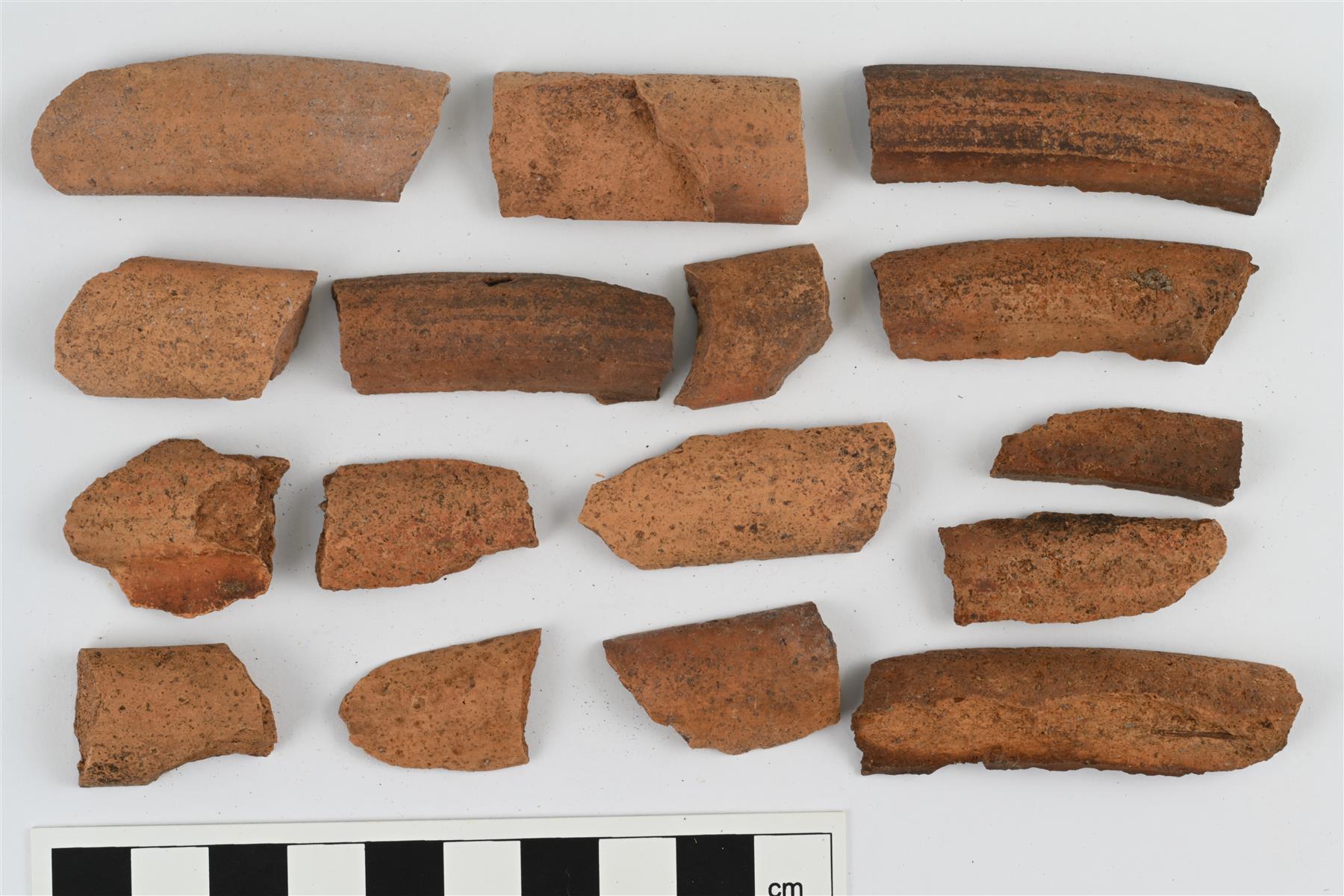 | Vatien reunan ulkopinnan paksunnoksesta lohjenneita paloja, eri astioista. Ei lasitetta. | |