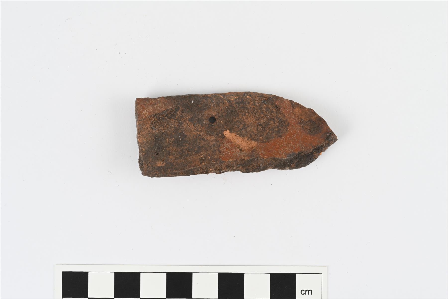 | Vadin pohjapala. Pohjareuna profiloimaton. Mukana kylkeä, johon tehty astian korjaamista varten pieni pyöreä reikä. Sisäpinnalla rippeitä värittömästä lyijylasitteesta. | |
