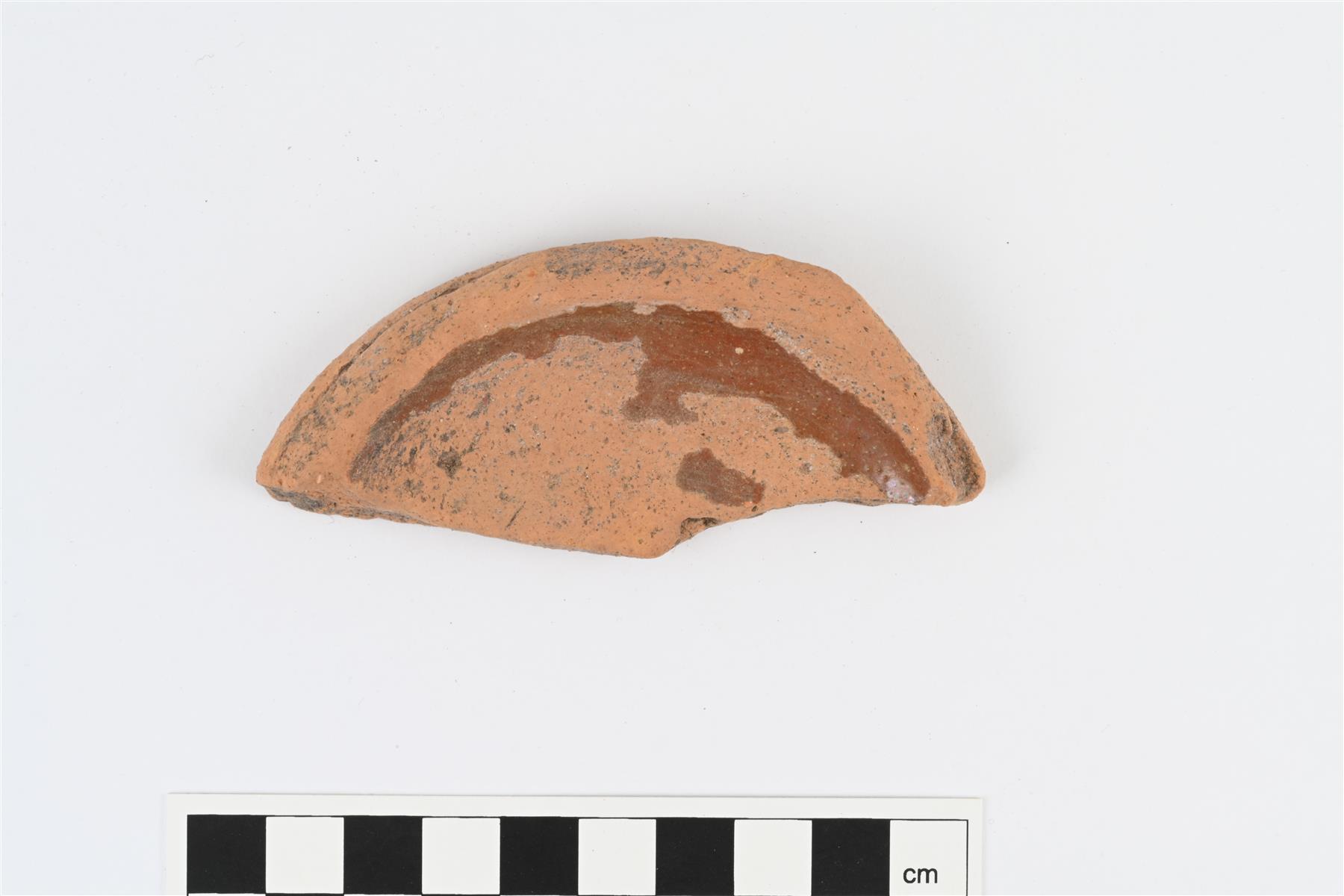 | Pohjapala, ruukusta, kulhosta tms. Pohjareuna profiloitu. Sisäpinnalla rippeitä värittömästä lyijylasitteesta. | |