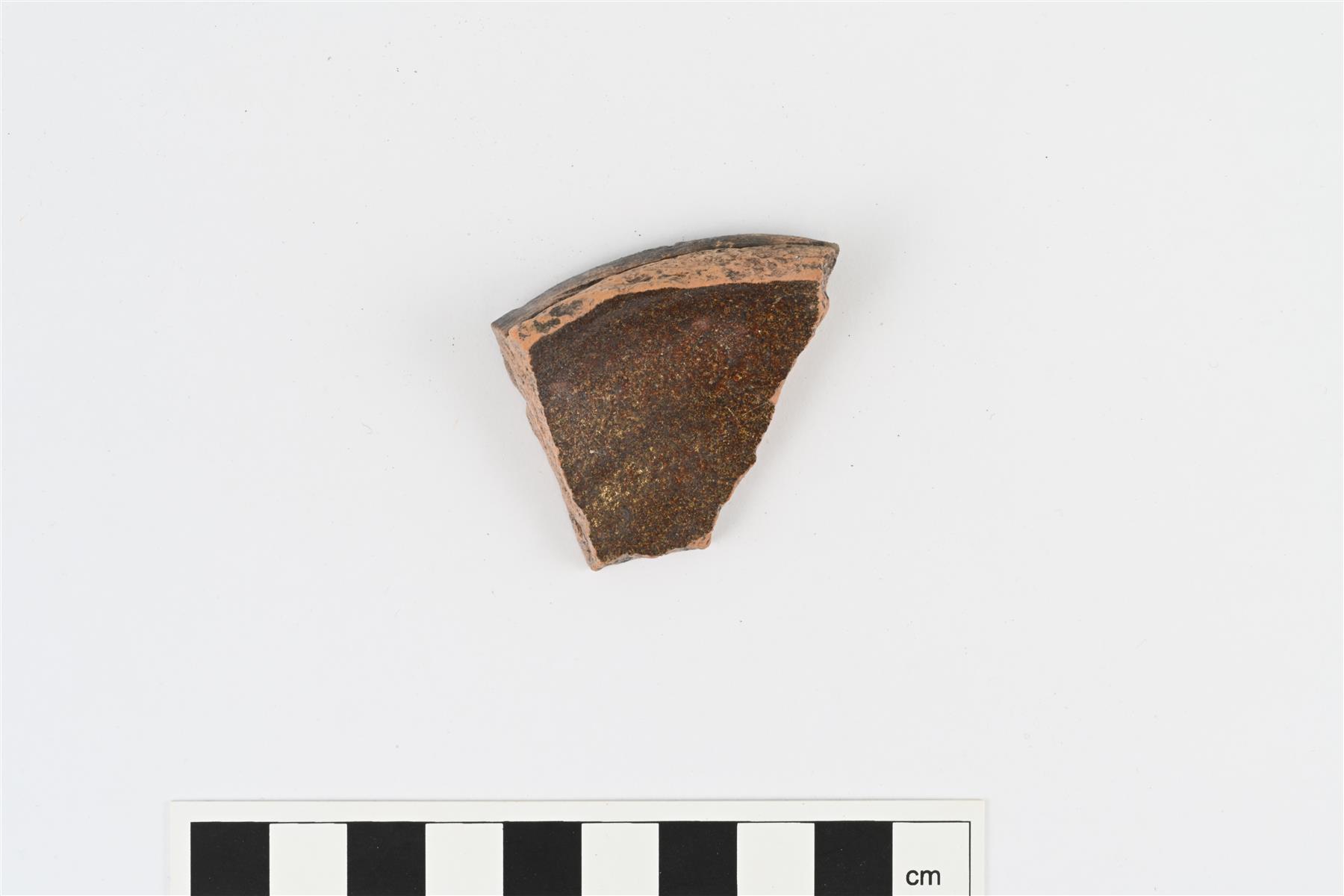 | Pohjapala ruukusta tms. Pohjareuna profiloitu. Sisäpinnalla ruskea lyijylasite. Pohjan halkaisija noin 120 mm. | |