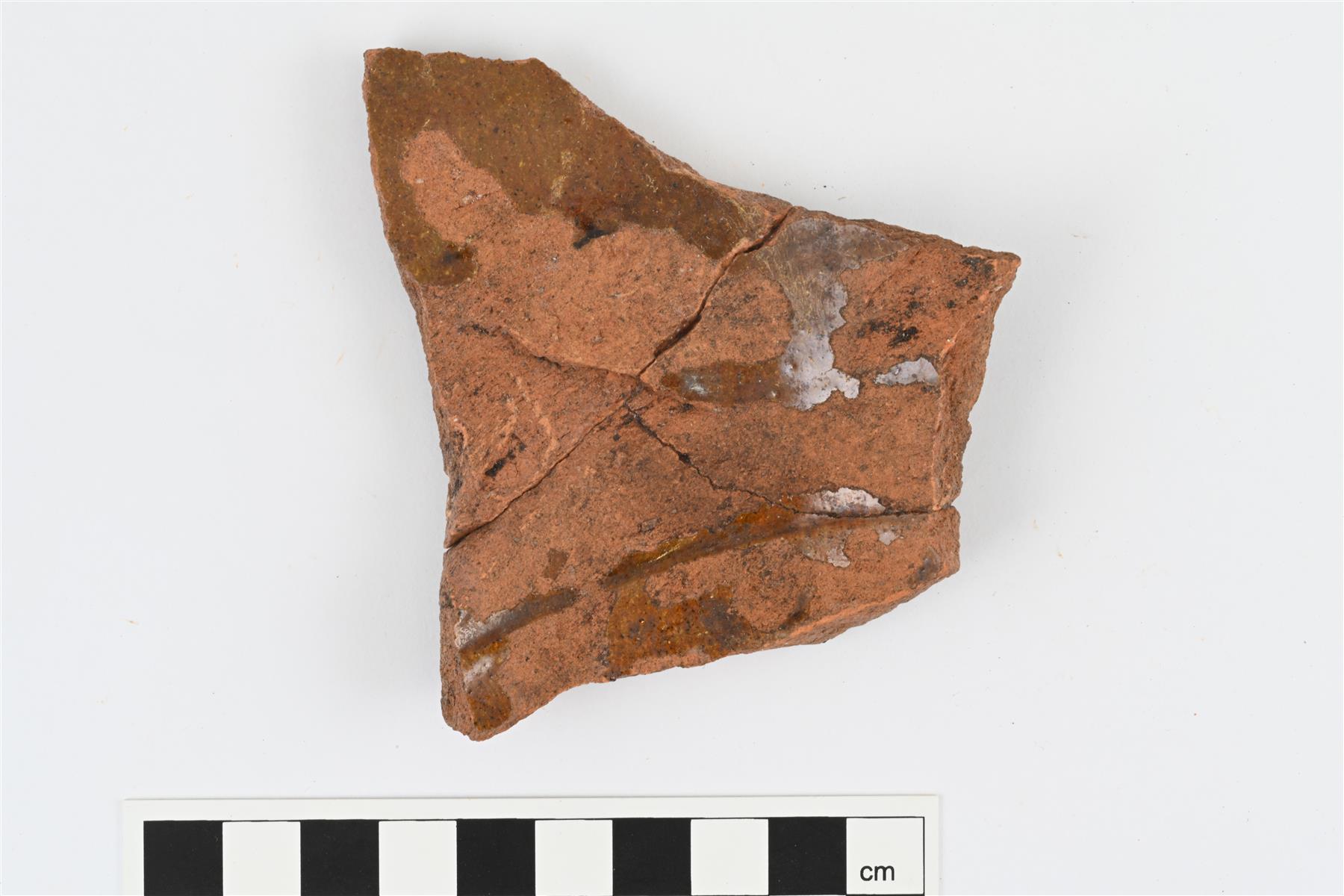 | Kylkipaloja, luultavasti ruukusta. Palat yhteensopivia ja yhteen liimattuja. Osassa ulkopintaa rihlausta. Sisäpinnalla väritön lyijylasite. | |