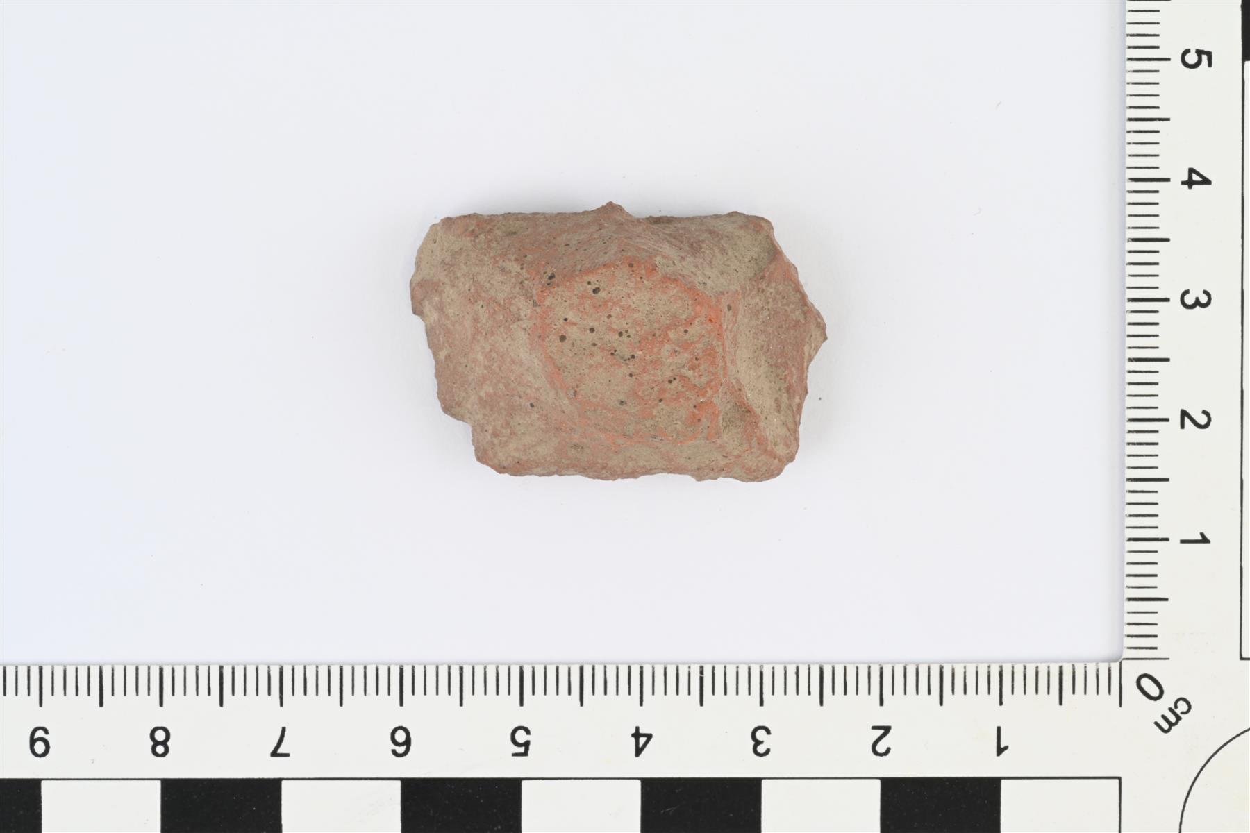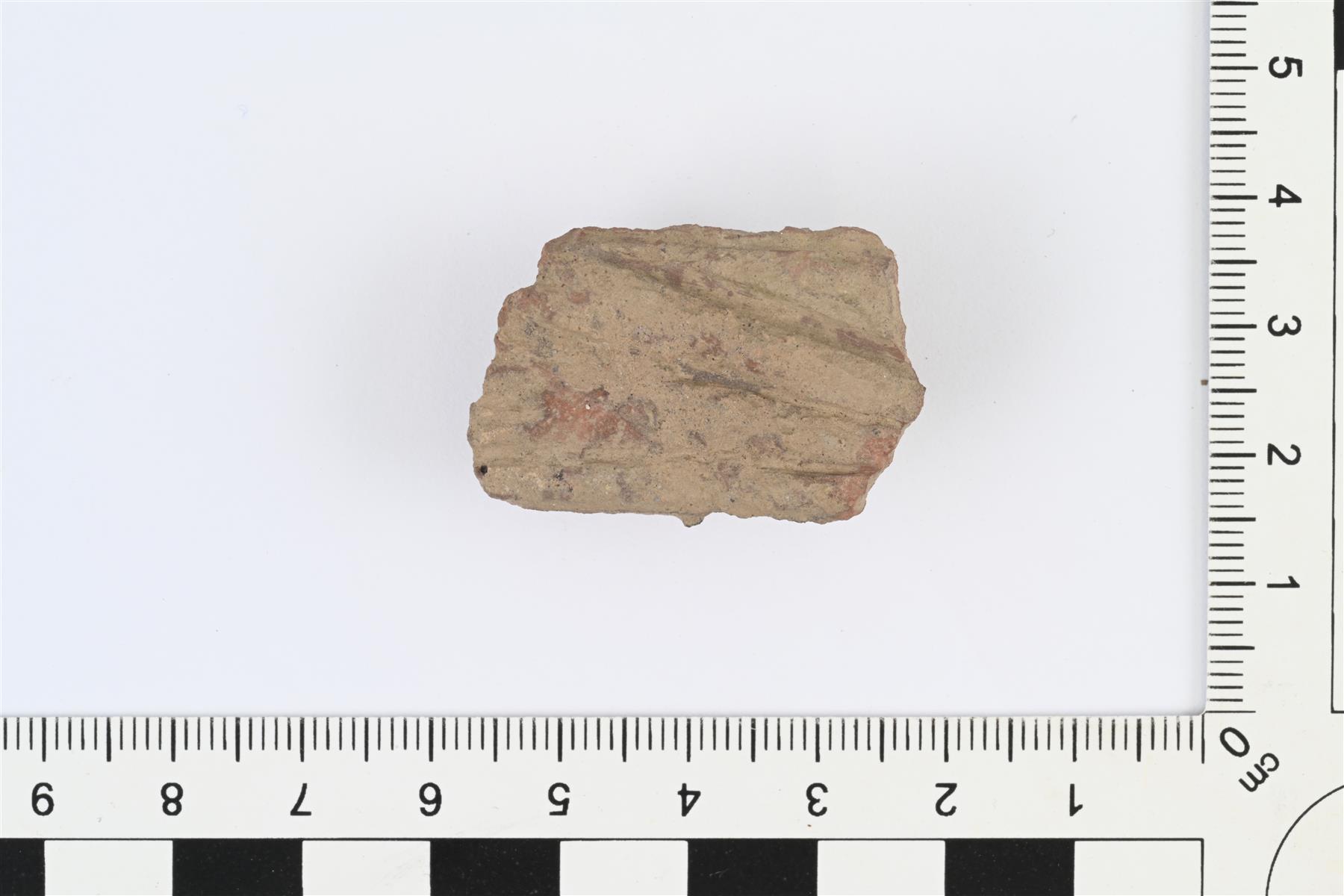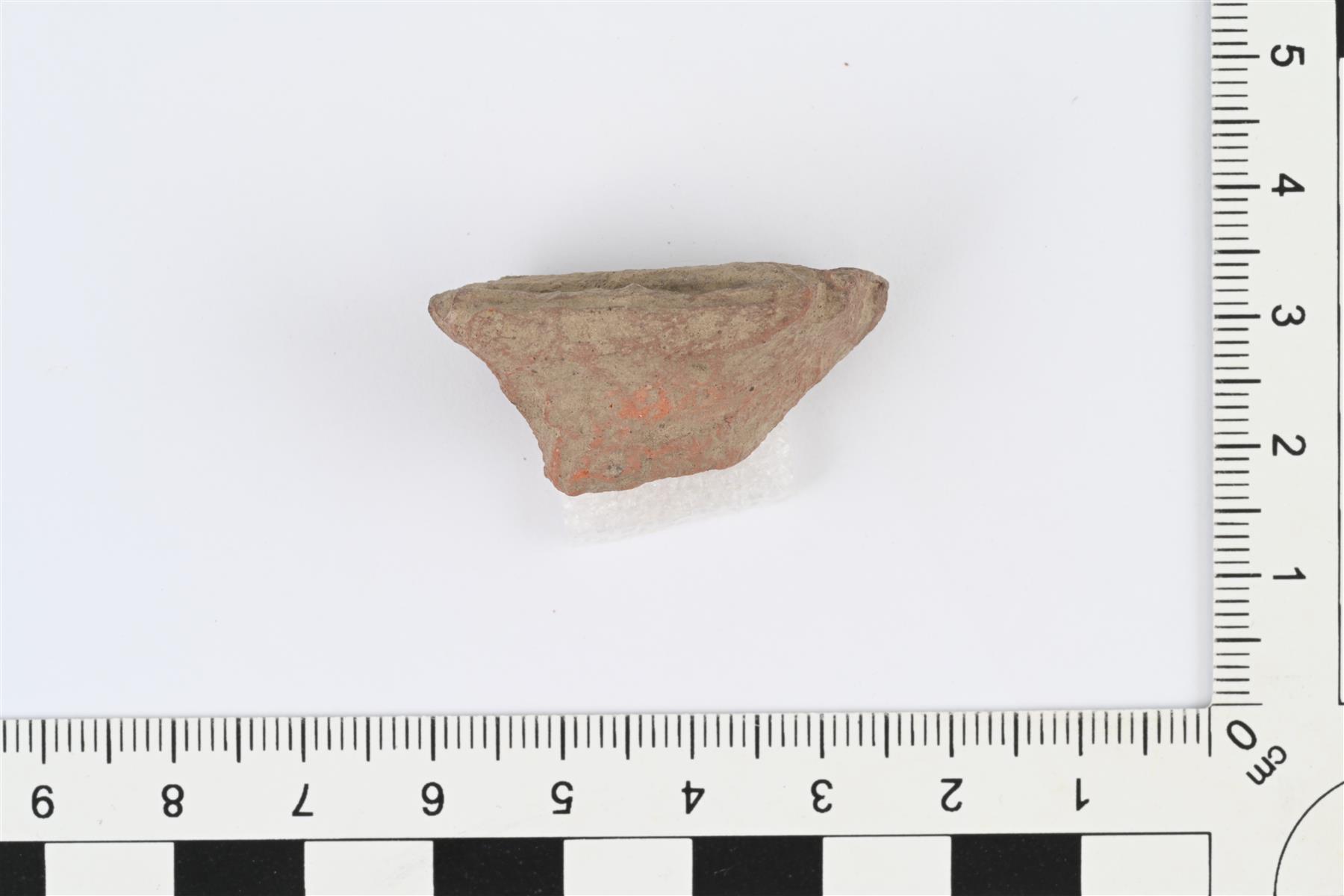 | Esineen katkelma, punasavikeramiikkaa. Karkea. Yksi pinta tasainen ja siinä vinoja uria. Toiselta puolelta suippeneva. | |