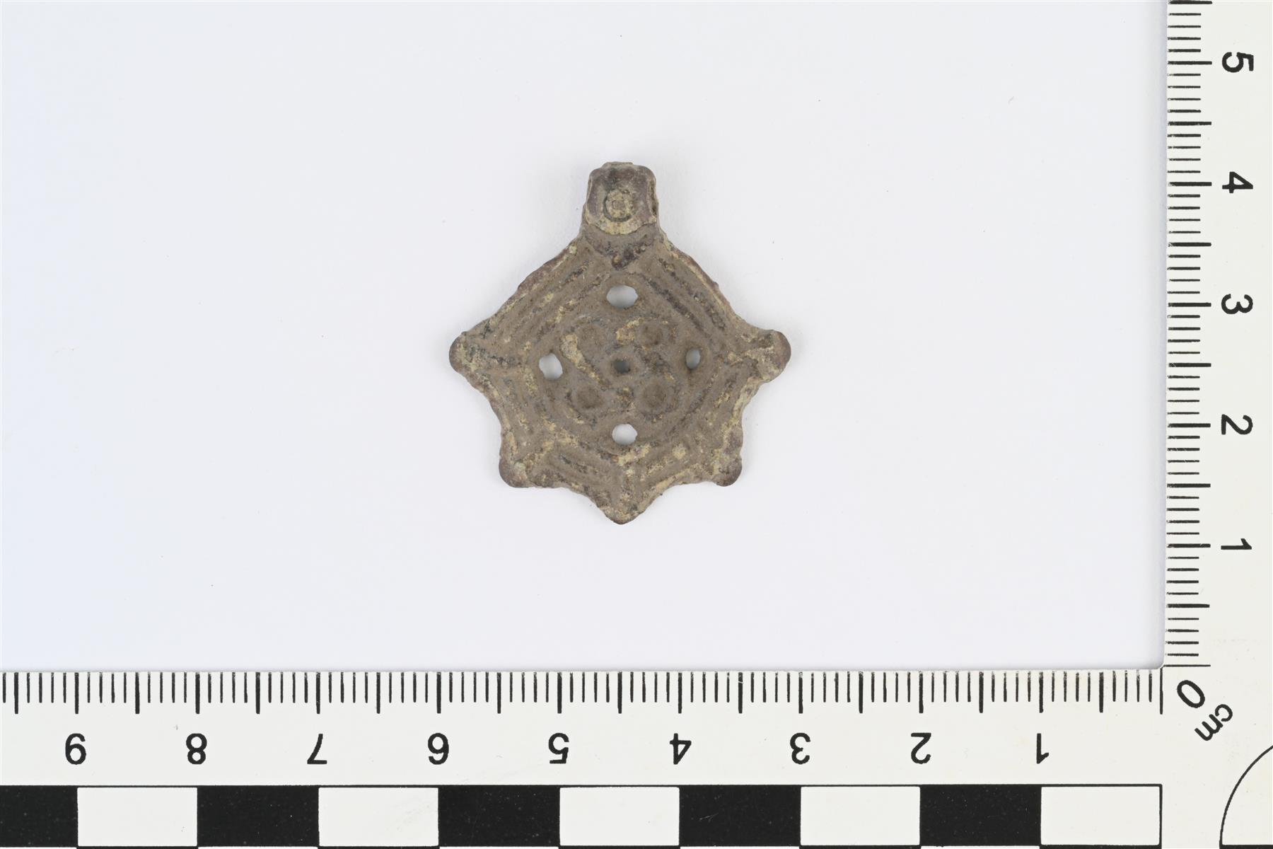 | Ehjä osmansolmuriipus. Viiva- ja reikäkoristelua. Vrt. Kivikoski 1973, Abb. 777. | |