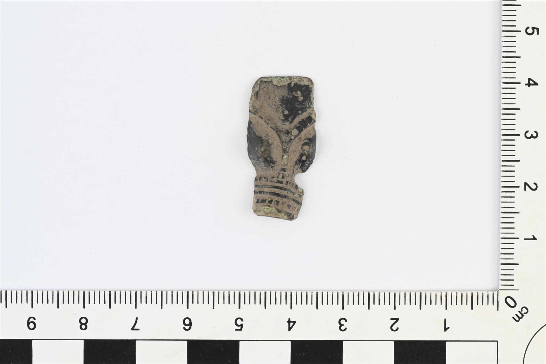 | Soljen tai rannerenkaan päätykatkelma, jossa Salin I -tyylinen pedonpää. Taustapuoli kärjestä kovera ja katkelmallisesta päästä tasainen. Etupuolella koristeluna pedonpään muotoa korostavia uurteita sekä kärjessä poikittaisia kohovöitä ja pisteviivoja. Vrt. Kivikoski 1973, Abb. 259. | |
