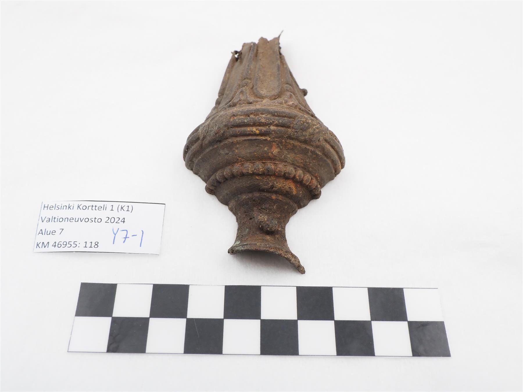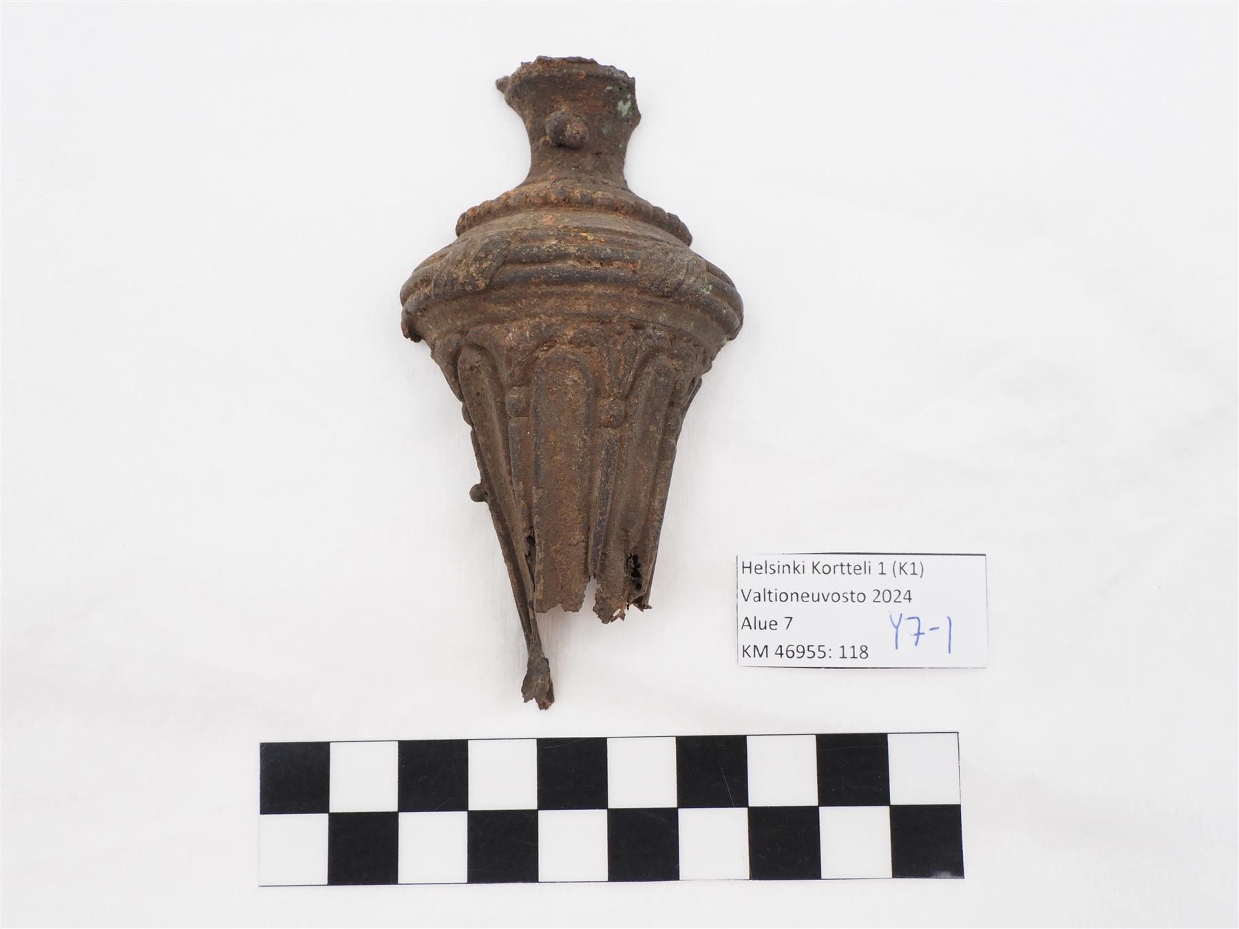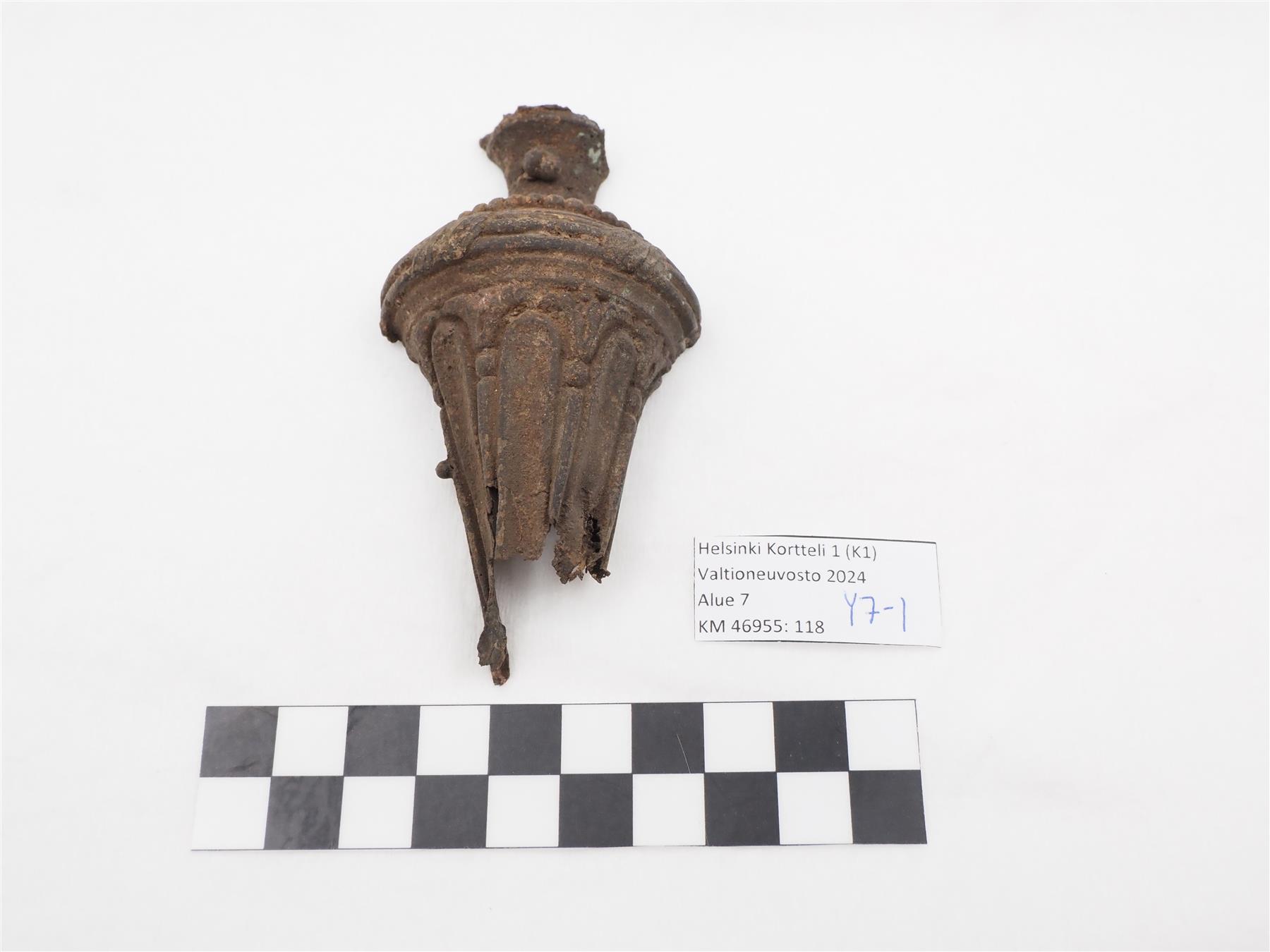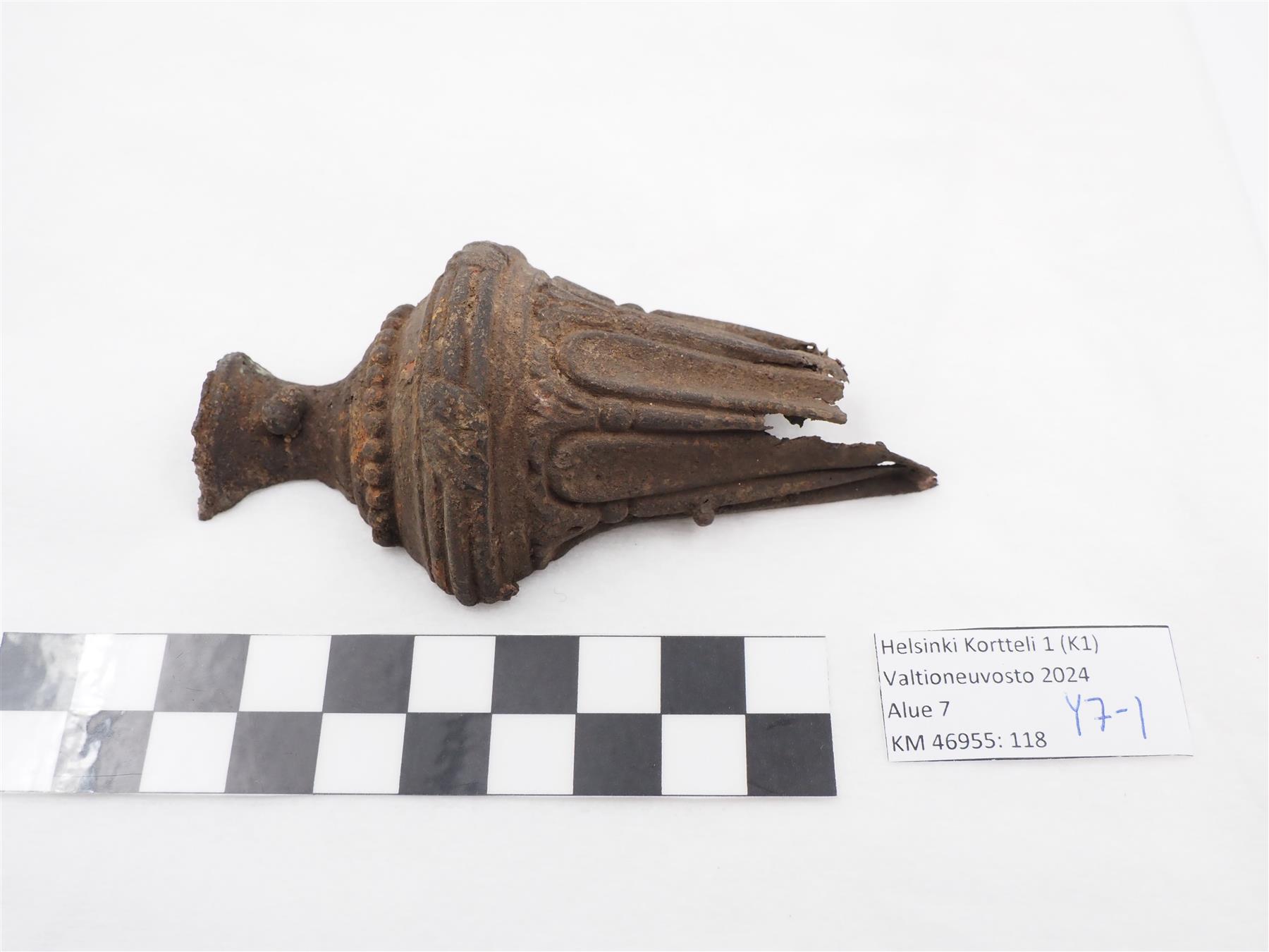 Kynttilänjalka on ollut pylväänmuotoinen ja kanneloitu ja siinä on erotettavissa helmisauva-koristelua. Esine voi edustaa tyyliltään joko ranskalaista uusklassistista Ludvig XVI:n tyyliä tai ranskalaisesta uusklassismista kehittynyttä kustavilaista tyyliä. Sisäosa on ontto. Halkaistu puoliksi, leikkaus hyvin tasainen. Alaosa repeytyneen näköinen. |