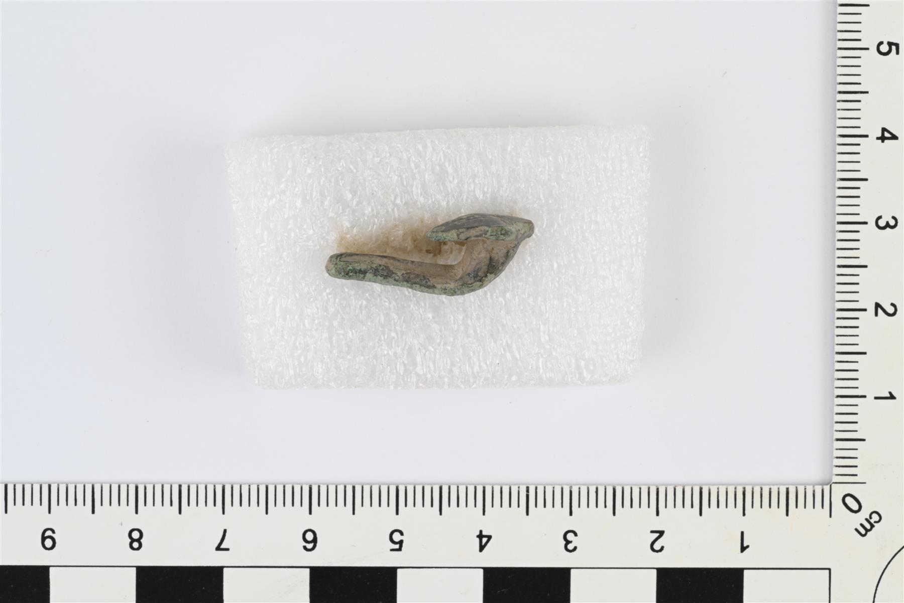 | Hevosenkenkäsoljen katkelma, jossa kaaren pää ja katkelmallinen nuppi. Kaari poikkileikkaukseltaan litteähkö, etupuoli hieman kupera. Nuppi lattea ja pyöristetyn neliön muotoinen, lähes puolet nupista lohjennut pois. Nupin etupuolella koristeluna viivoista ja pisteviivoista koostuva vinoristi sekä kulmissa ja keskellä ympyräleimat. | |