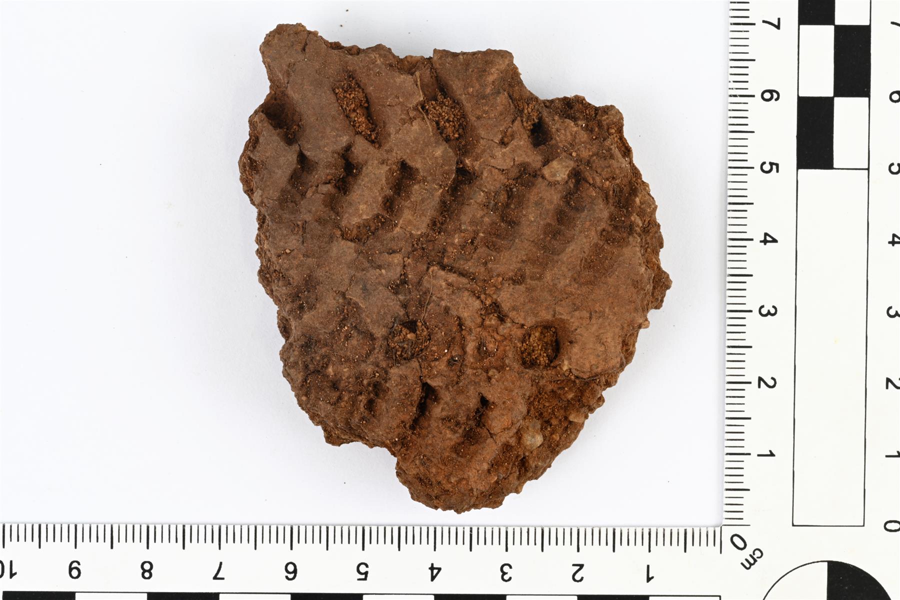 | Kampakeraamisen astian kylkipala. Koristeltu vinojen kampaleimojen muodostamilla kentillä. Keskellä on lisäksi pyöreitä kuoppia. Sekoitteena kivimurskaa. Raekoko on n. 2-5 mm. | |