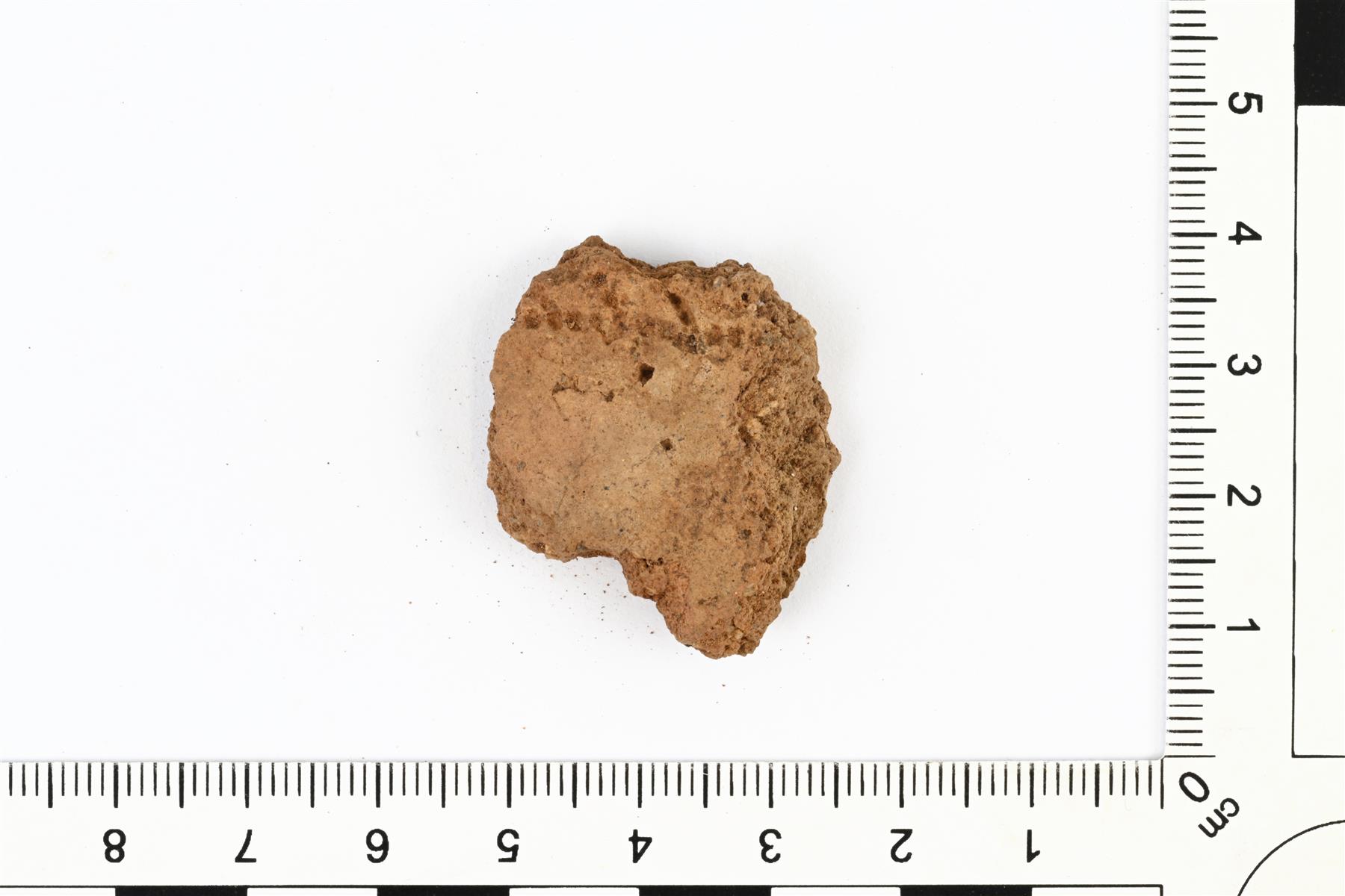 | Kampakeraamisen astian kylkipala. Koristeltu pistemäisillä viivoilla. Osa pinnasta on jätetty ilman koristelua. Sekoitteena kivimurskaa. Raekoko on n. 1-3 mm. | |