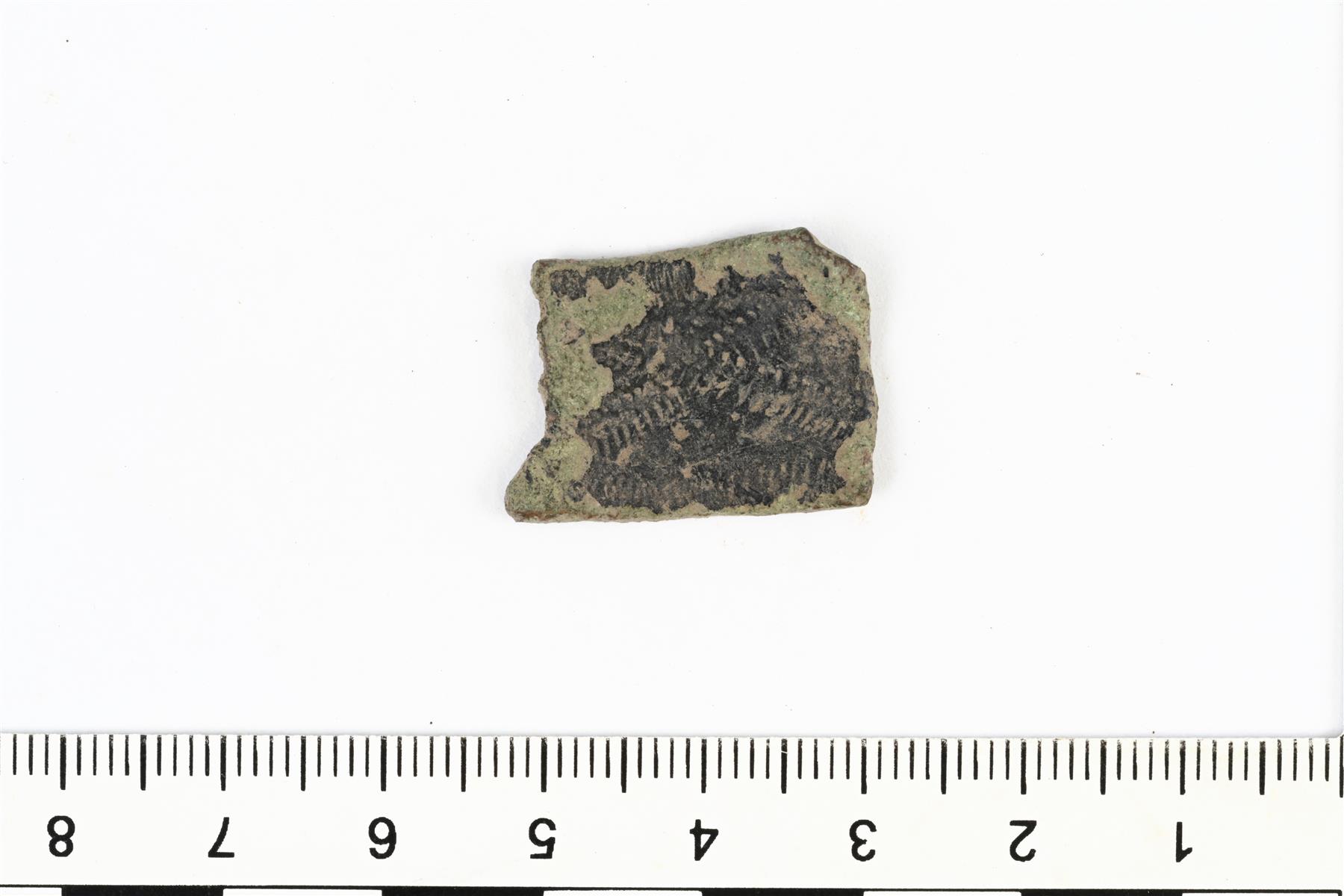 | Suorakaiteenmuotoinen levyn katkelma. Koristeluna kaiverrettuja viivakuvioita. Mahdollisesti helasta. | |