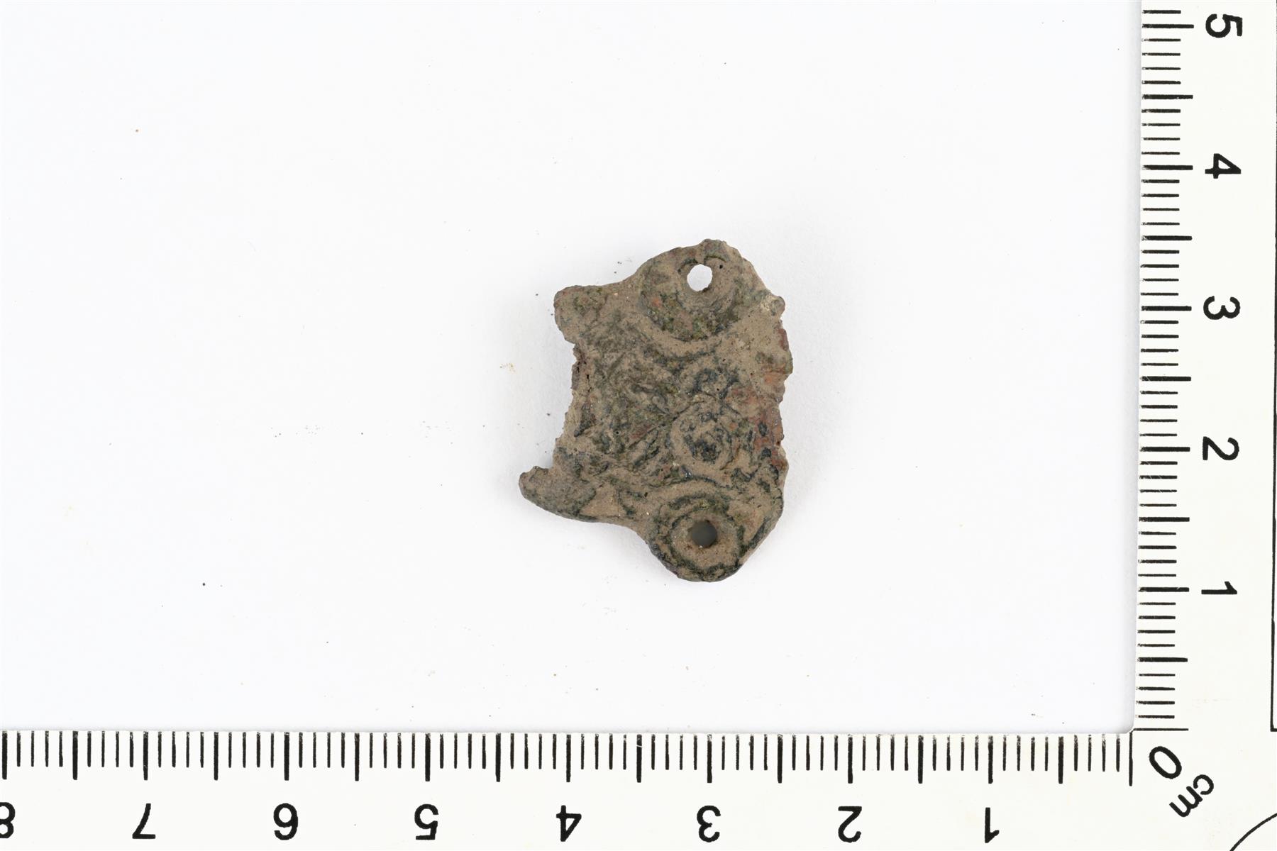 | Skandinaavisen tasavarsisoljen katkelma. Pääty ja keskiosa puuttuvat. Koristeluna viivauurreornamentiikkaa ja sivuilla olevat pyöreät reiät. Taustapuolella on säilyneenä neulakota. Vrt. Kivikoski Abb. 674. | |