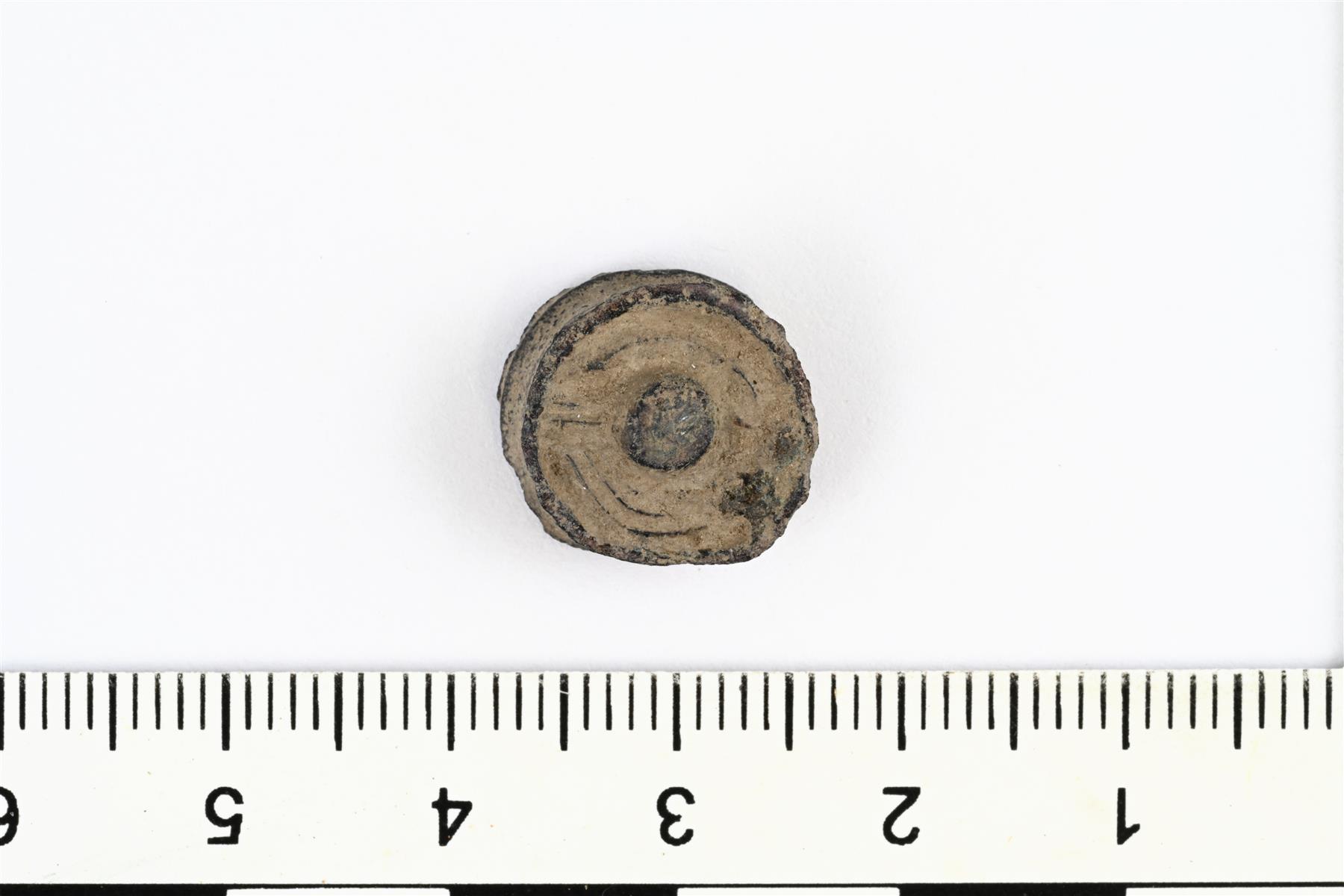 | Pyöreä korunappi. Alareuna on murentunut. Yläpinnassa on koristeluna puolipallo ja Salin I -tyylin ornamentiikkaa. Vrt. Leppäaho No. 43-45. | |