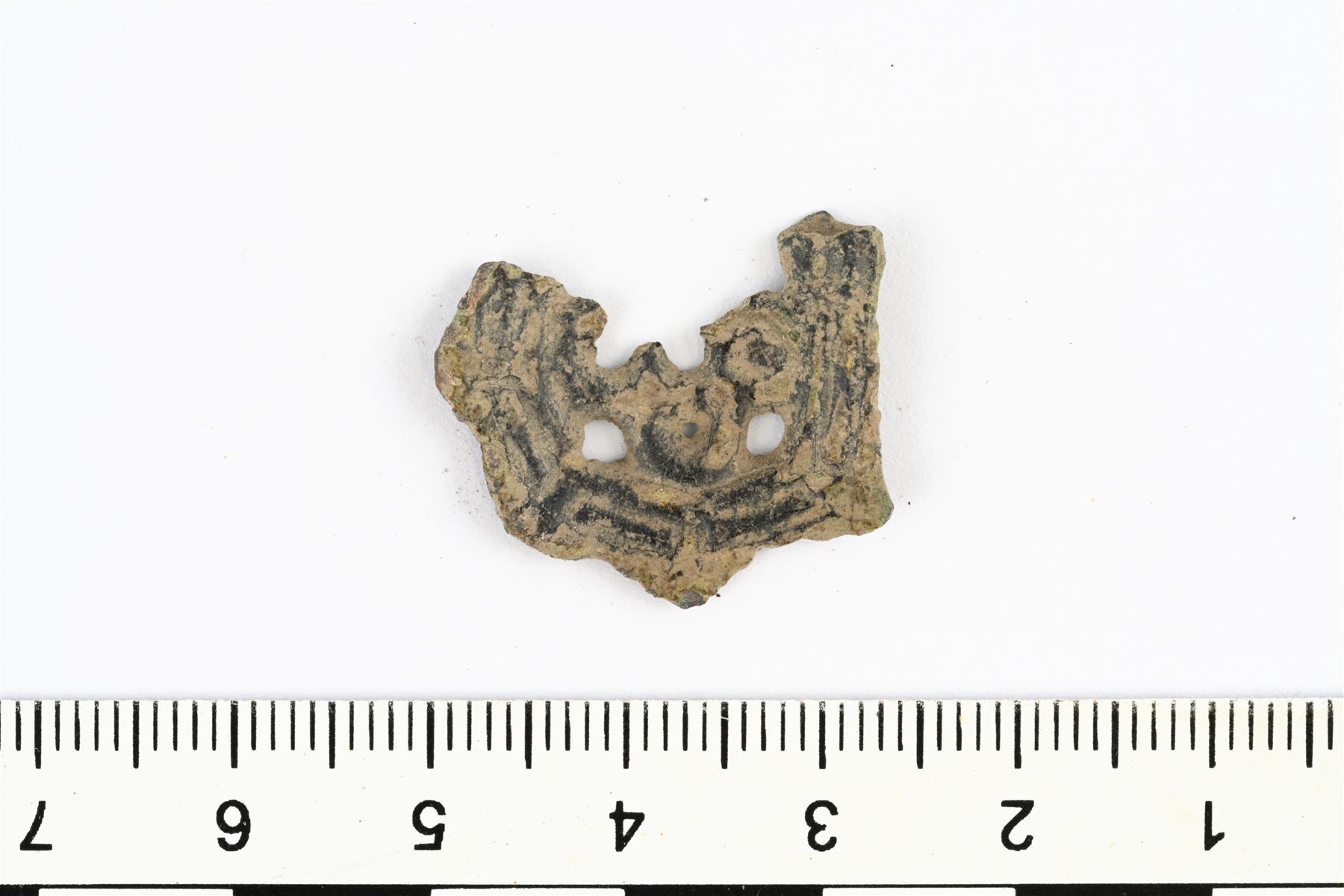 | Pyöreän osmansolmuriipuksen puolikas. Ulkoreunassa on kolmiomaisia ulkonemia. Reunaa kiertää kaksi viivauurretta. Keskellä on pyöreitä reikiä. Vrt. Kivikoski Abb. 777. | |