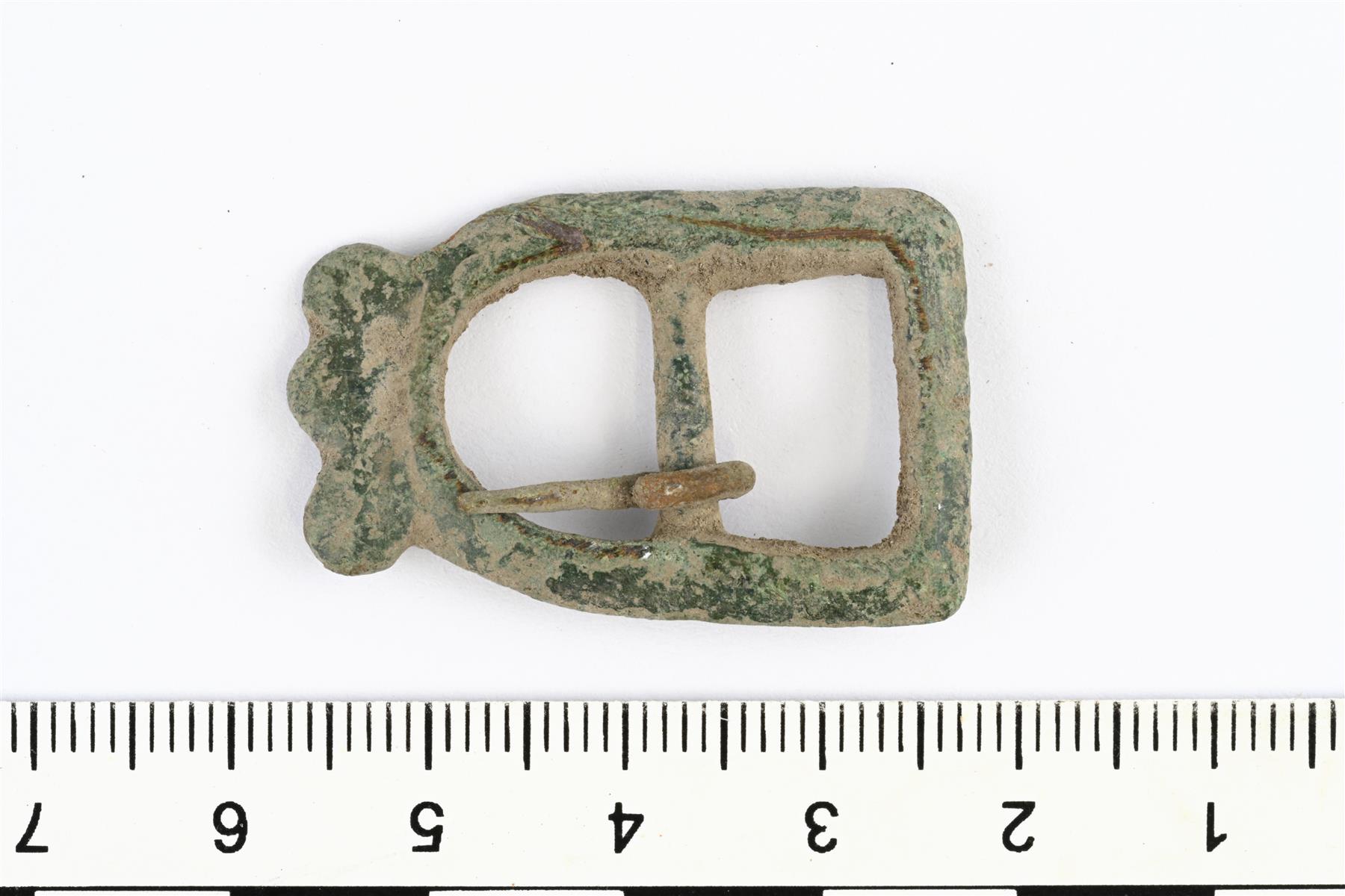 | Epäsymmetrinen vyönsolki. Neula on hyvin siro. Pääty on puolipyöreä ja siinä on koristeluna kolmelehtinen ulkonema. | |