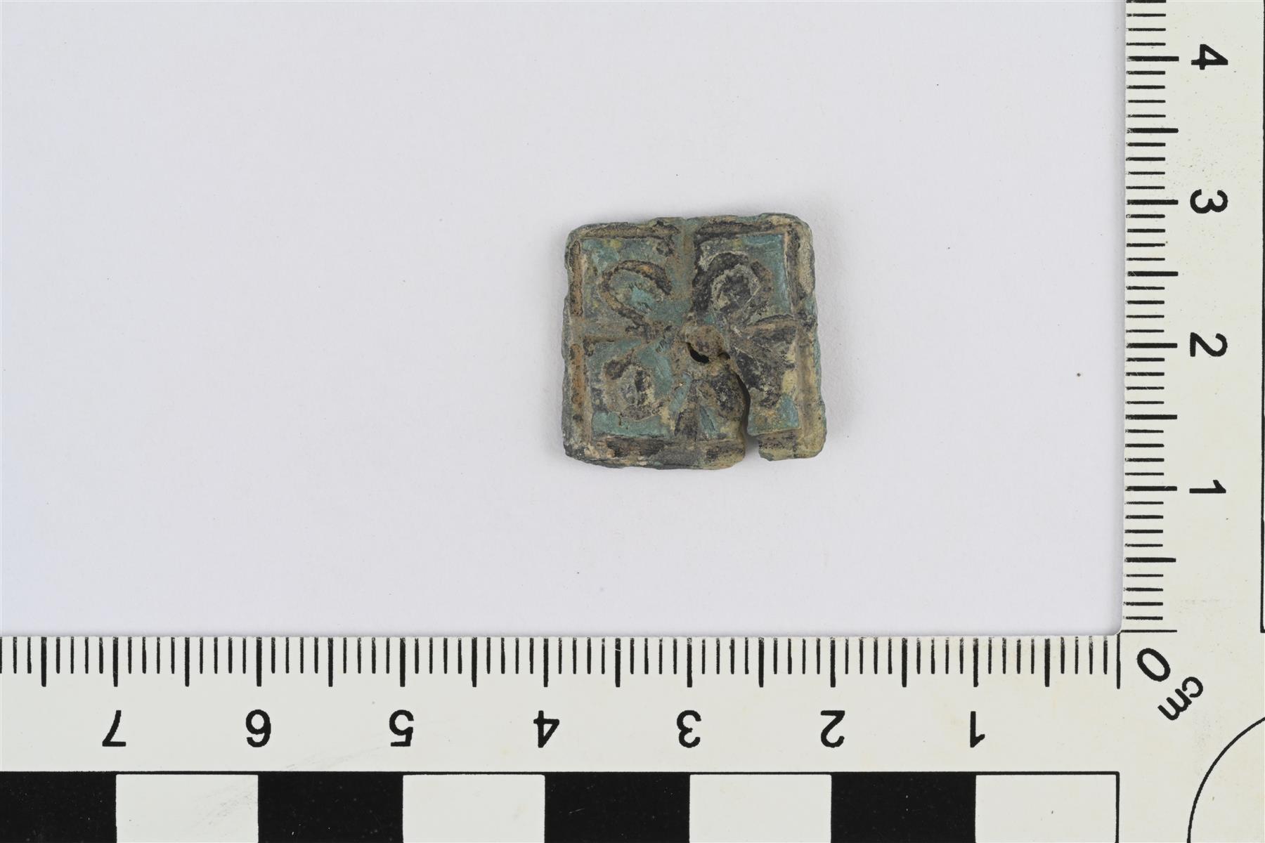 | Neliönmuotoinen ruusukehela. Etupuolella reliefikoristeluna pyöreäsakarainen vinoristi. Keskellä reikä. | |