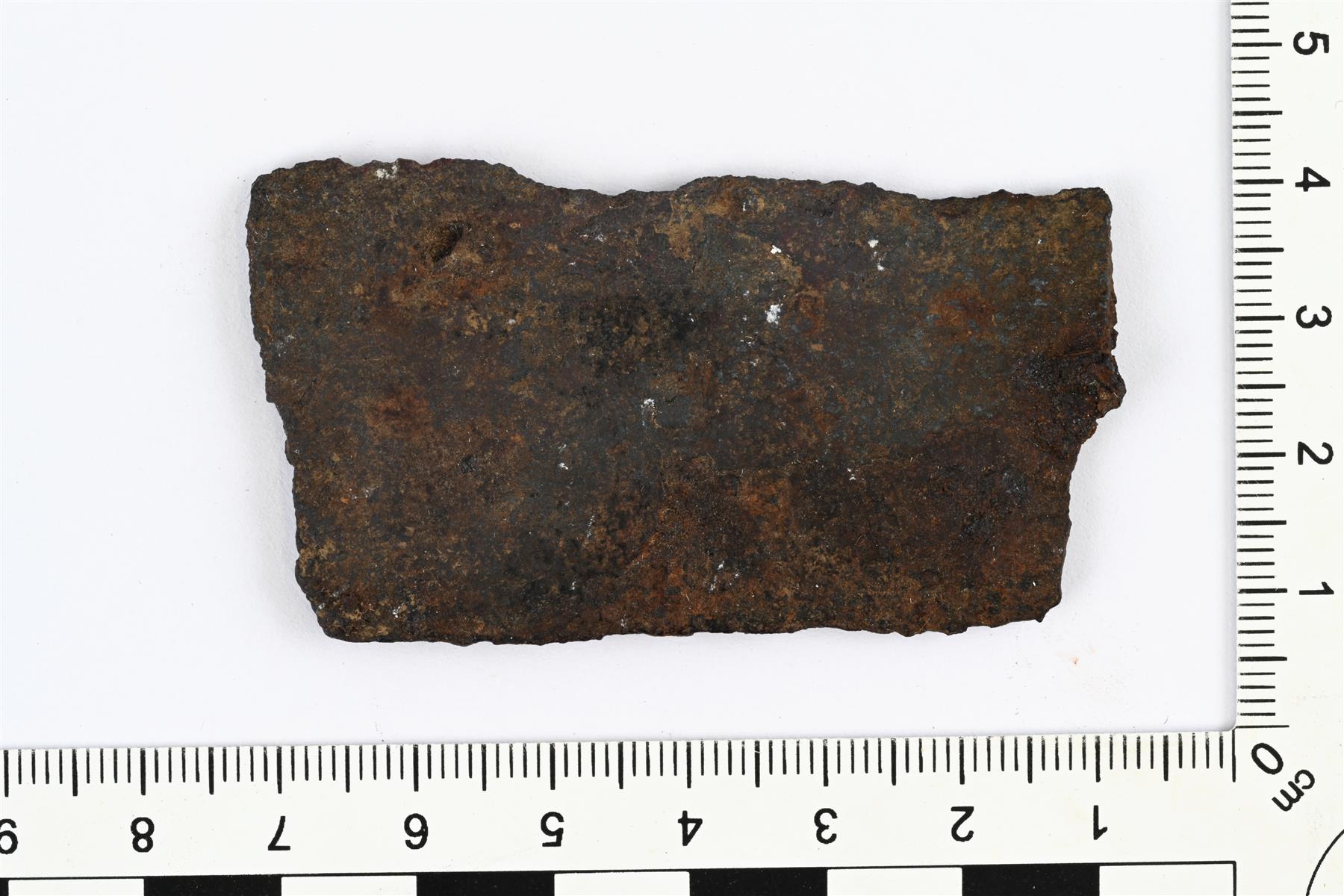 | Todennäköinen kaksiteräisen miekan säiläkatkelma. Kummallakin lappeella on hyvin matala veriura. Toisessa päässä on jälkiä säilän taivuttamisesta. Hyväkuntoinen. | |