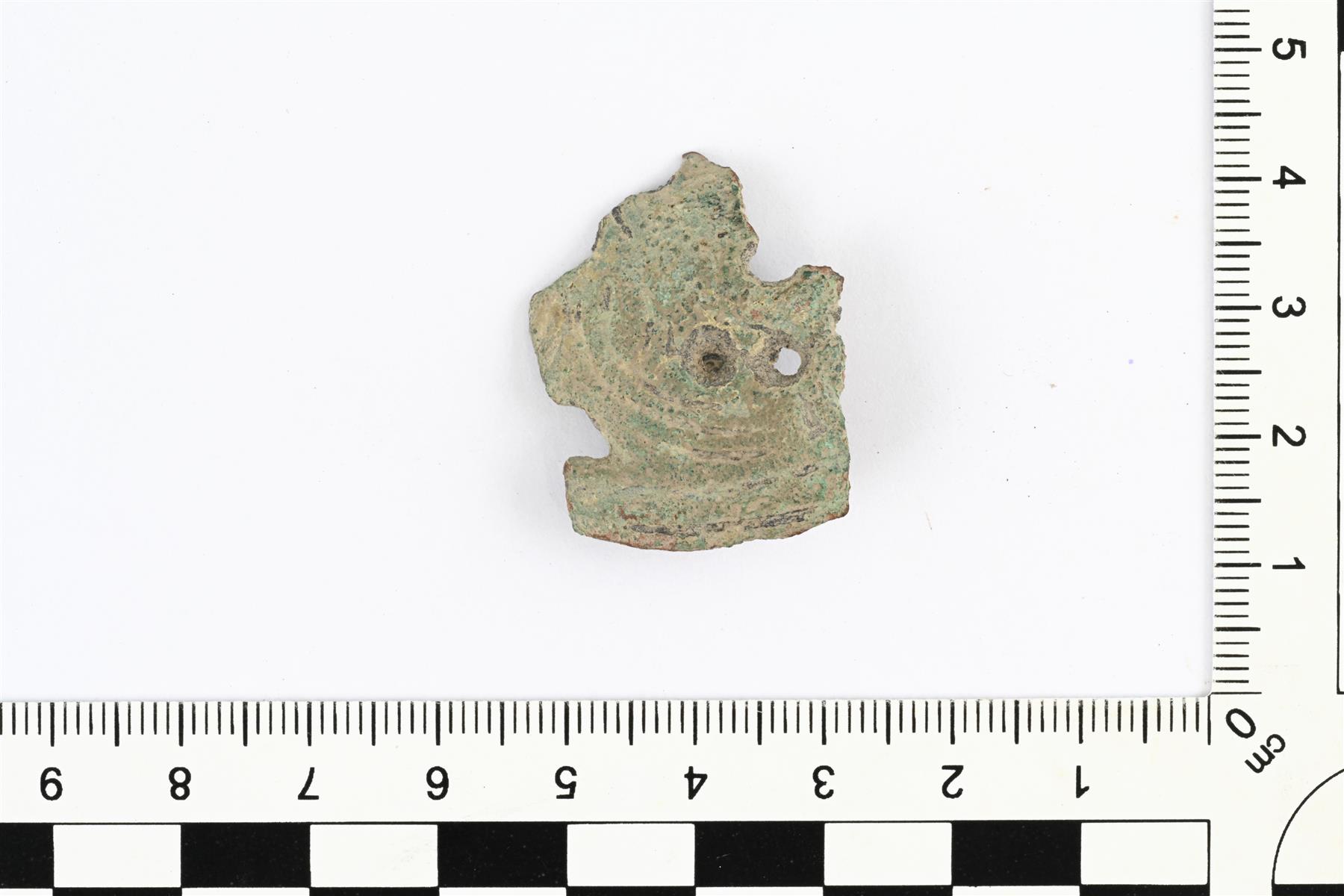 | Kaksieläimisen pyöreän kupurasoljen katkelma. Koristeluna pyöreitä reikiä ja viivauurteilla tehtyjä nauhakäärmeitä. Taustapuolella on jousilaitteen kiinnityslenkki. Vrt. Kivikoski Abb. 662. | |