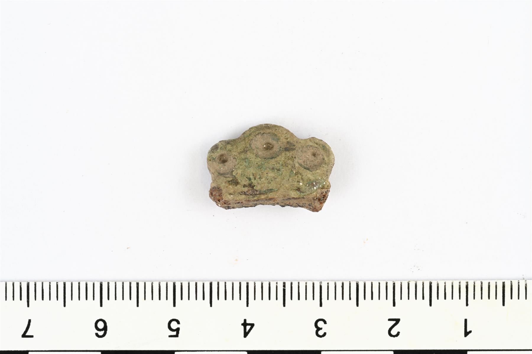| Pöytäveitsen päätehela. Päädyssä on kolme lehdykkää, joiden keskellä on reiät. Veitsen ruodosta on säilyneenä pieni jäänne. Vrt. Holtmann Abb. 165. | |