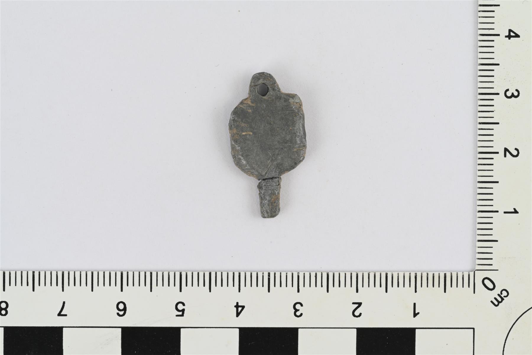 | Metalliesine, mahdollisesti kellonavain. Harmaata metallia, mahdollisesti hopeaa tai tinaa. Litteä, mutta melko paksu. Keskiosa soikeahko, toisessa päässä kapea uloke ja toisessa päässä lenkki. Melko viimeistelemätön, muoto hieman epäsäännöllinen. | |