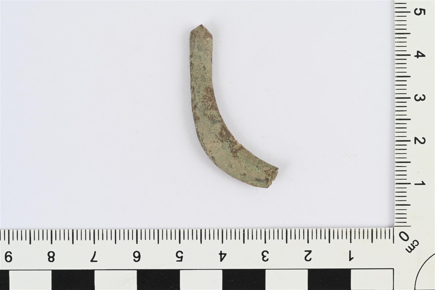 | Katkelmallinen karhunhammasriipus. Ohut ja siro. Kärki katkennut, yläpäästä katkennut ripustuslenkki. | |