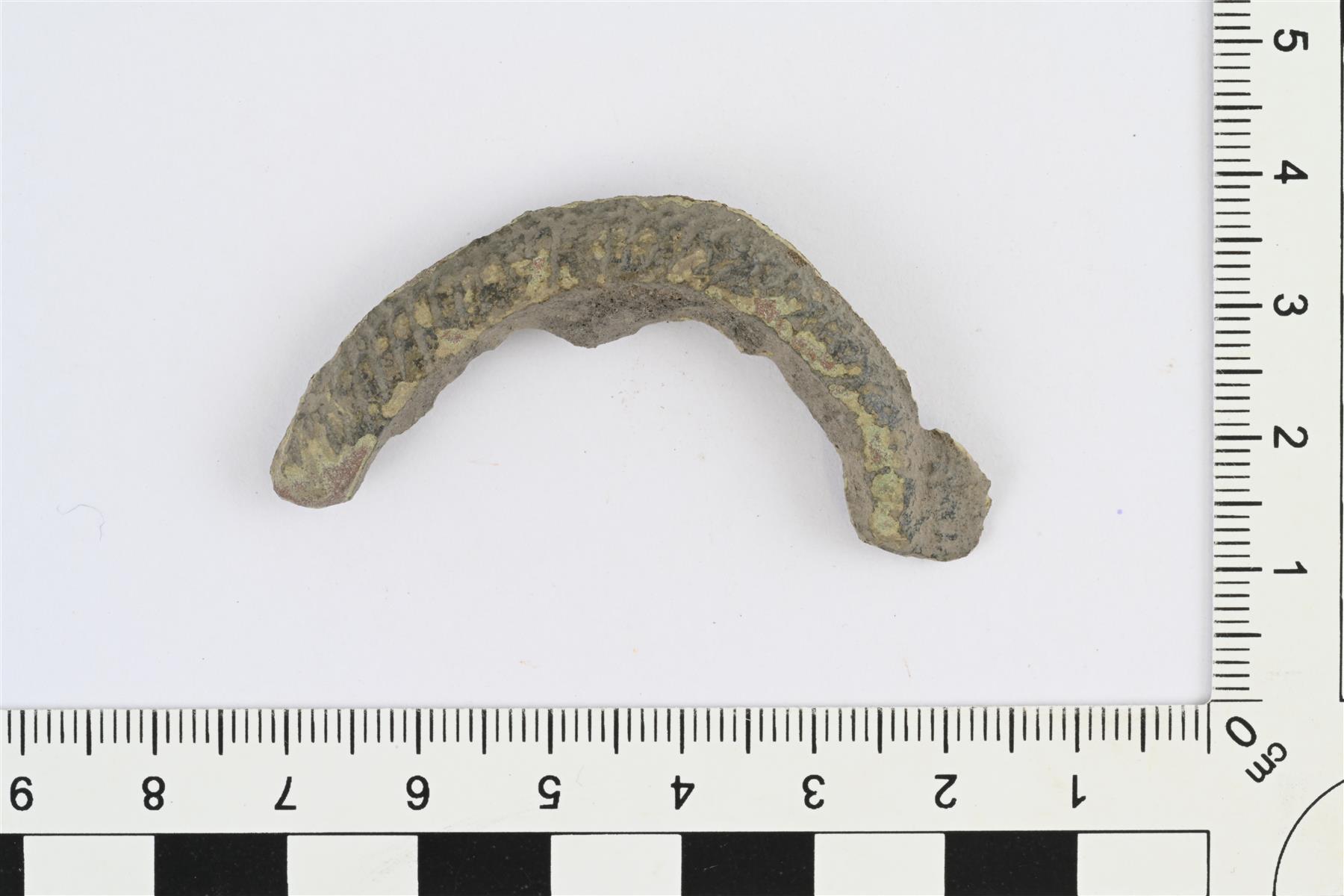 | Hevosenkenkäsoljen kaaren katkelma. Osittain sulanut. Poikkileikkaus luultavasti rombimainen. Pinnassa vinoviivakoristelua. | |