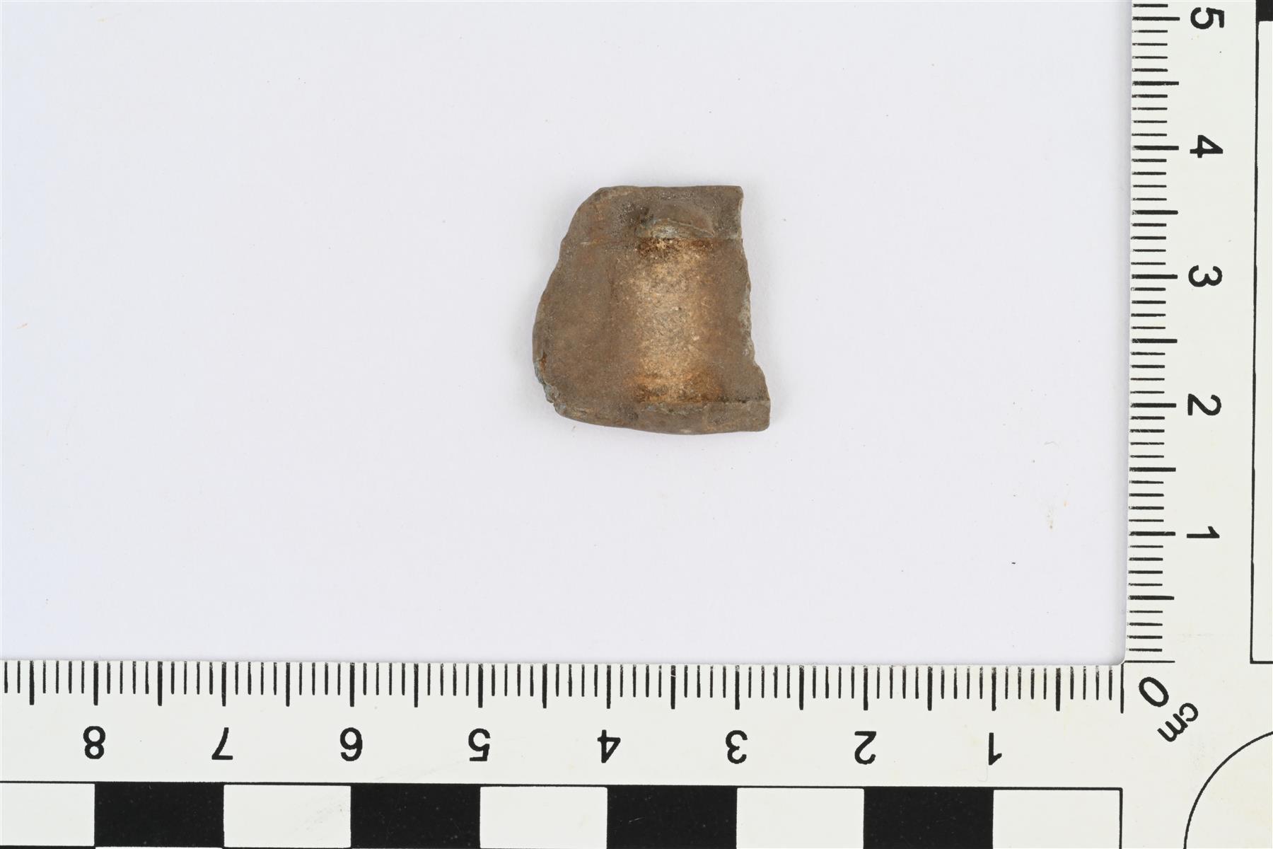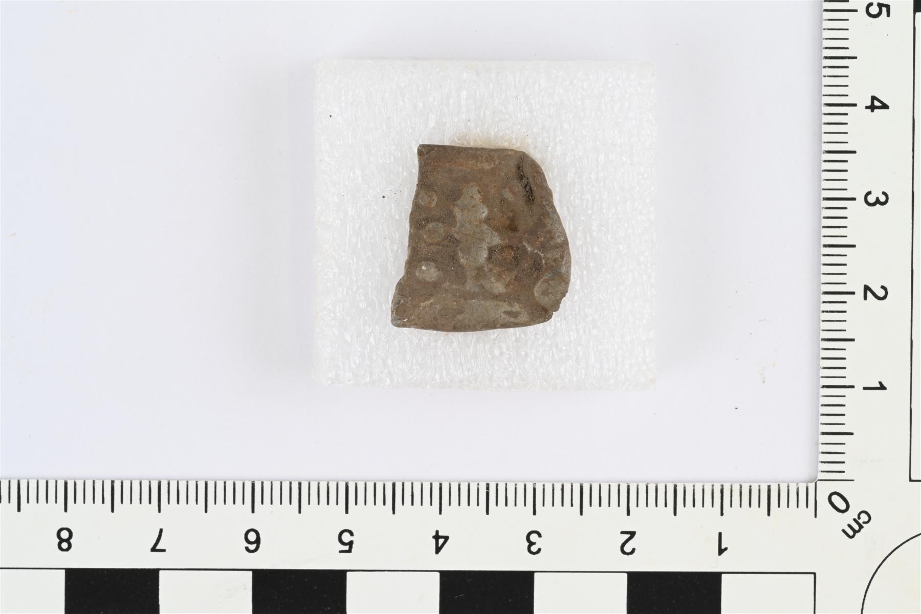 | Vyön- tai hihnanhelan katkelma, luultavasti tinaseosta. Hela ollut lähinnä suorakulmion muotoinen, hieman epäsäännöllinen ja kömpelö. Etupuolella reliefikoristelua. Taustapuolelta katkennut reunasta toiseen kulkeva kapea poikittainen kiinnitin. | |