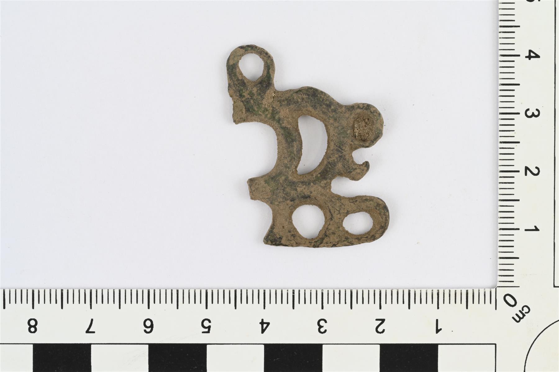 | Ketjunkantajan katkelma. Puolikas leveästä ja puhkonaisesta ketjunkantajasta. Yläreunassa ripustuslenkki ja alareunassa rivissä pyöreitä reikiä, keskiosassa reikäkoristelua. | |