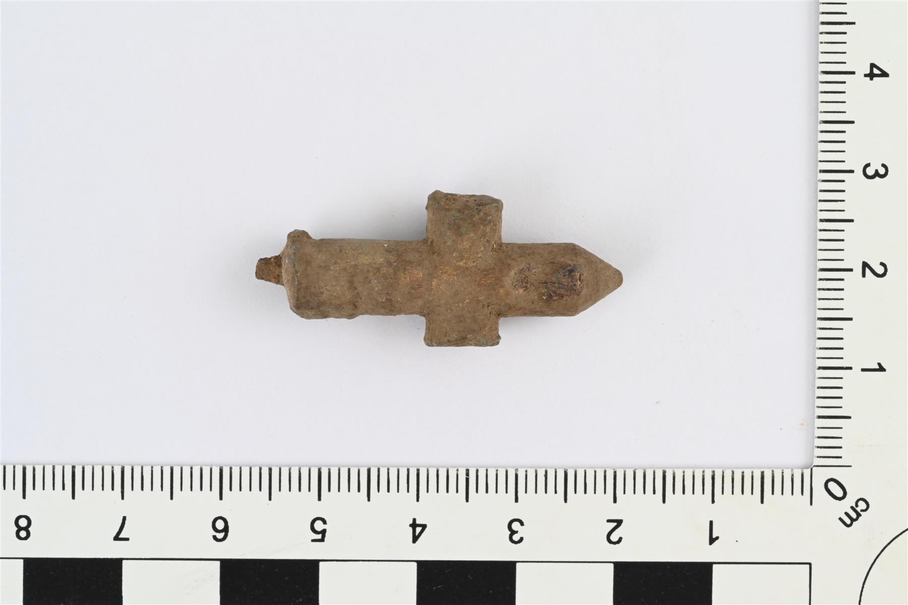 | Lyijyesineen katkelma. Ristinmuotoinen, kaksi vartta pitkät ja niistä toinen suippopäinen, kaksi vartta lyhyet. | |
