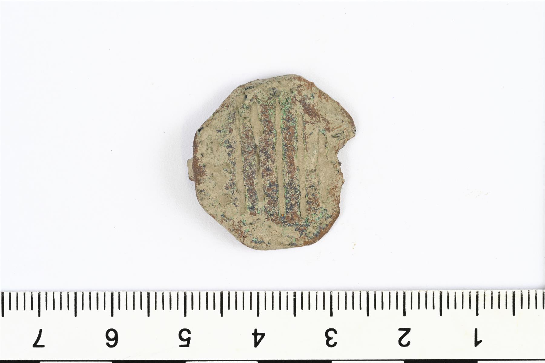 | Todennäköinen valjaiden koristehela. Muodoltaan kahdeksansivuinen. Etupuolella on koristeluna pystypalkkien muodostama kenttä. Taustapuolen kiinnityslenkki on hajonnut. | |