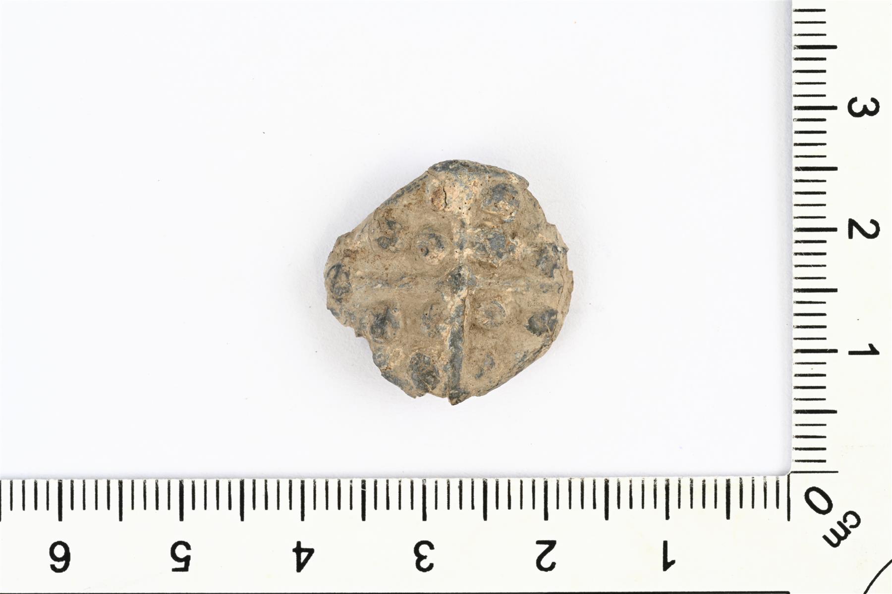 | Talonpoikaisen sormuksen katkelma. Säilyneenä pyöreä etuosa, jossa on koristeena kohokuvioinen risti ja puolipalloja. Reunat ovat murentuneet. | |