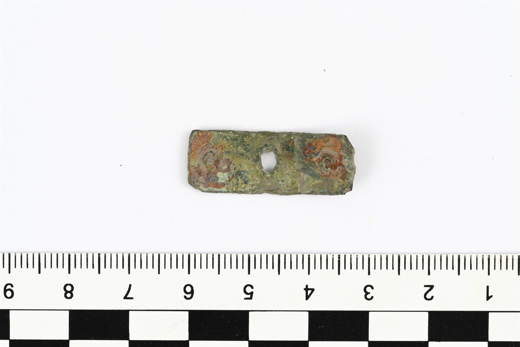 | Suorakaiteenmuotoinen kupariseoslevy. Keskellä kulkee kolme reikää, joista kaksi on ummessa. | |